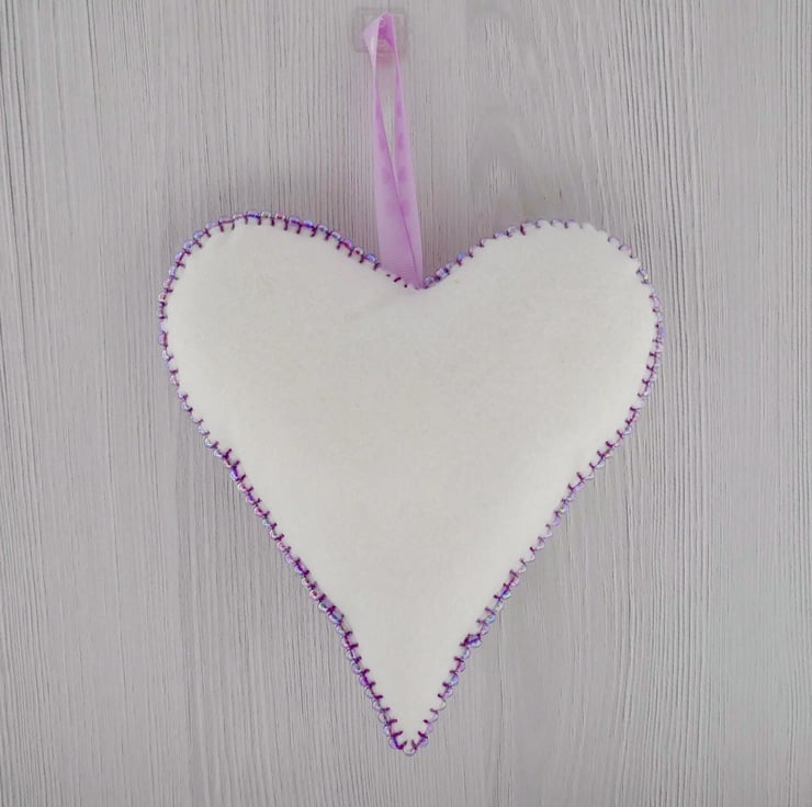 Felt Hanging Heart: Embroidered Love Peace Joy with beaded edge 16cm