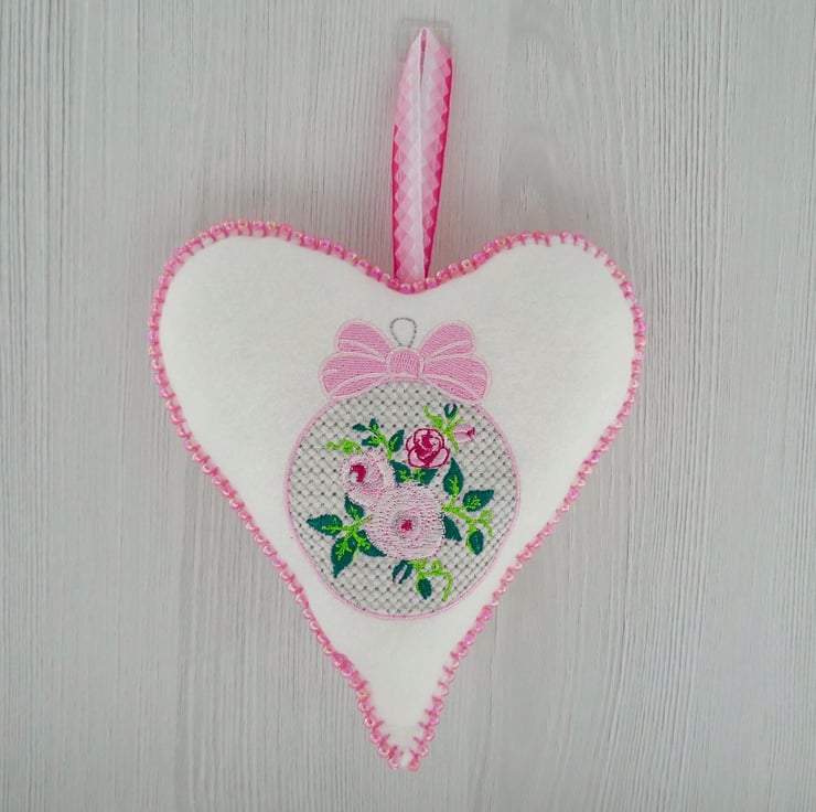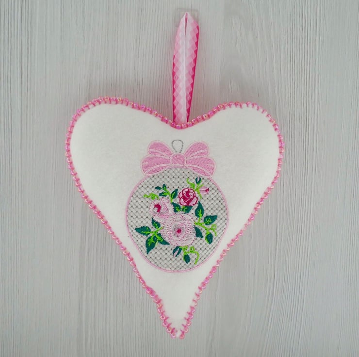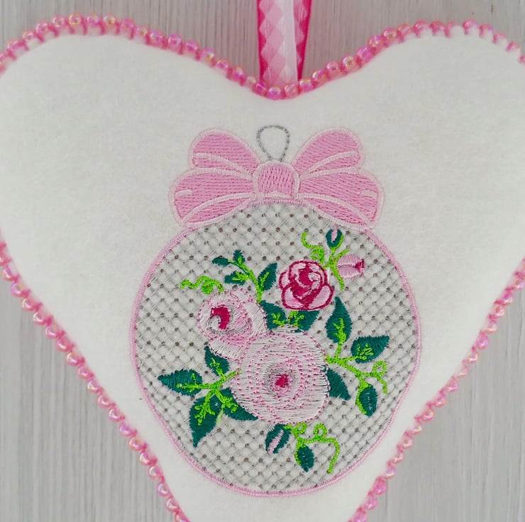 Rose Bauble design Embroidered Felt Hanging Heart with beaded edge, on a Light Cream background. Machine embroidered with a pretty Rose design bauble in shades of Pink with Green foliage and an embroidered Pink bow.