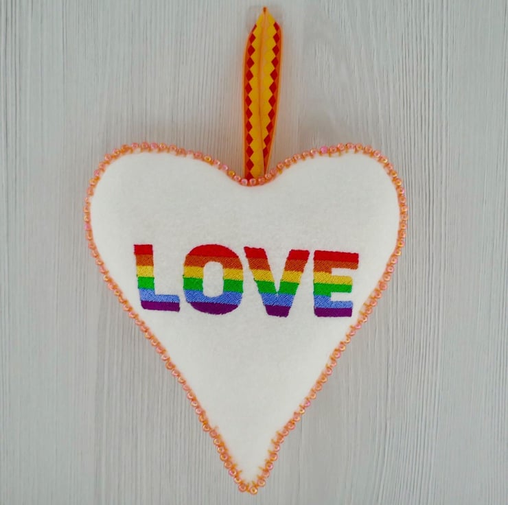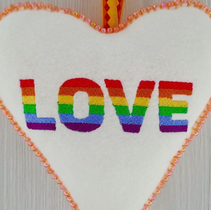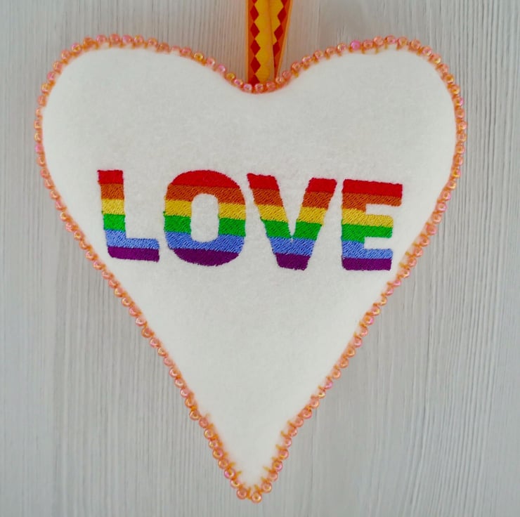 Love design Embroidered Felt Hanging Heart with beaded edge, on a Light Cream background. Machine embroidered with the word: Love in rainbow colours.