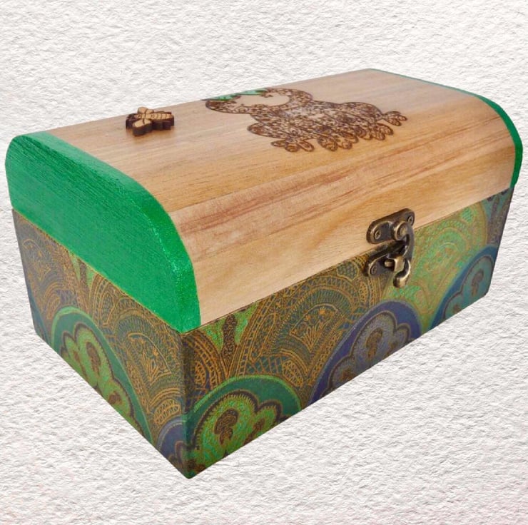 Treasure Chest design box with engraved lid and decoupaged lower half. With hinged lid and catch, and the inside base lined with felt.