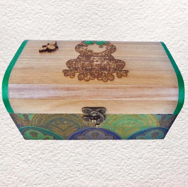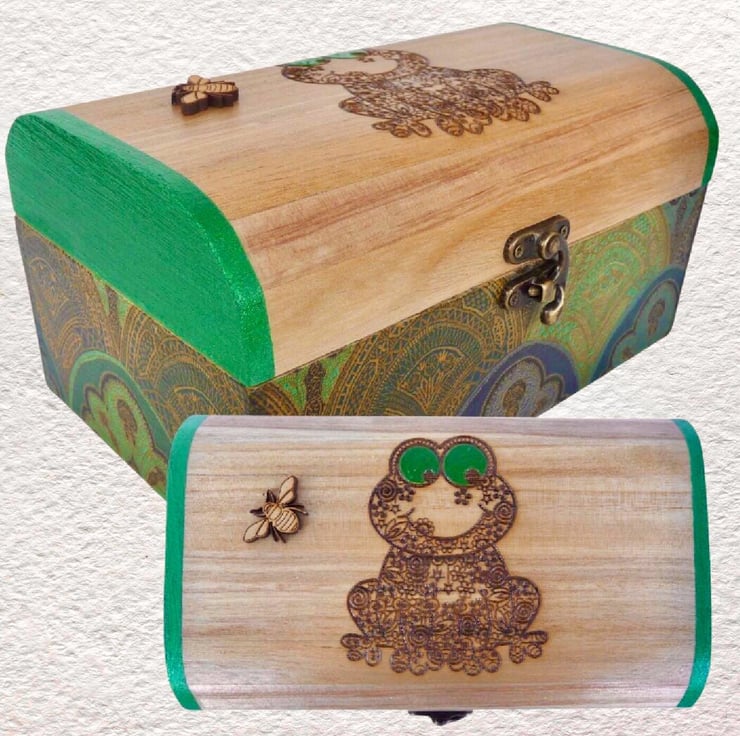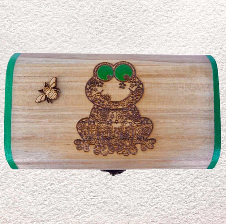 Engraved & Decoupaged cute Frog design Wooden Trinket / Keepsake Box