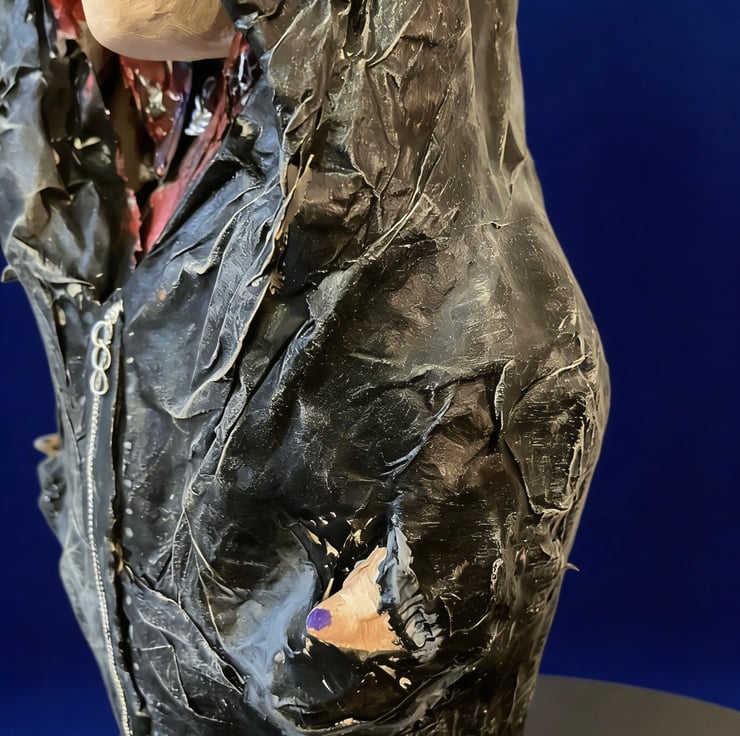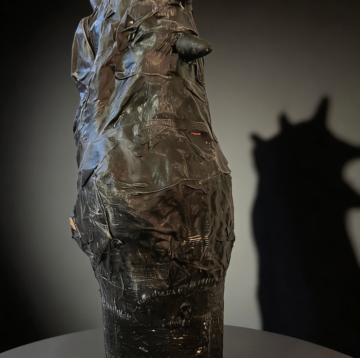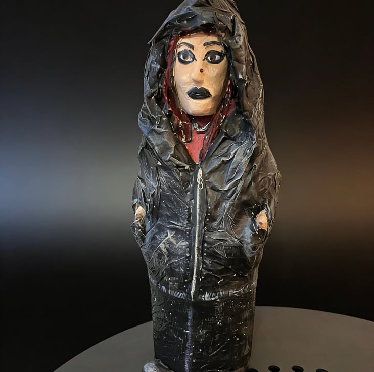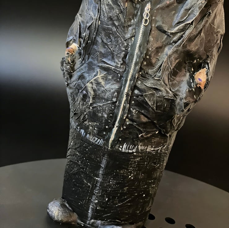 Jade began life as a discarded liter glass bottle, providing a sturdy, weighted core. From there, I hand sculpted her entire form using paper mache. I have worked the material to create a rugged leather texture.