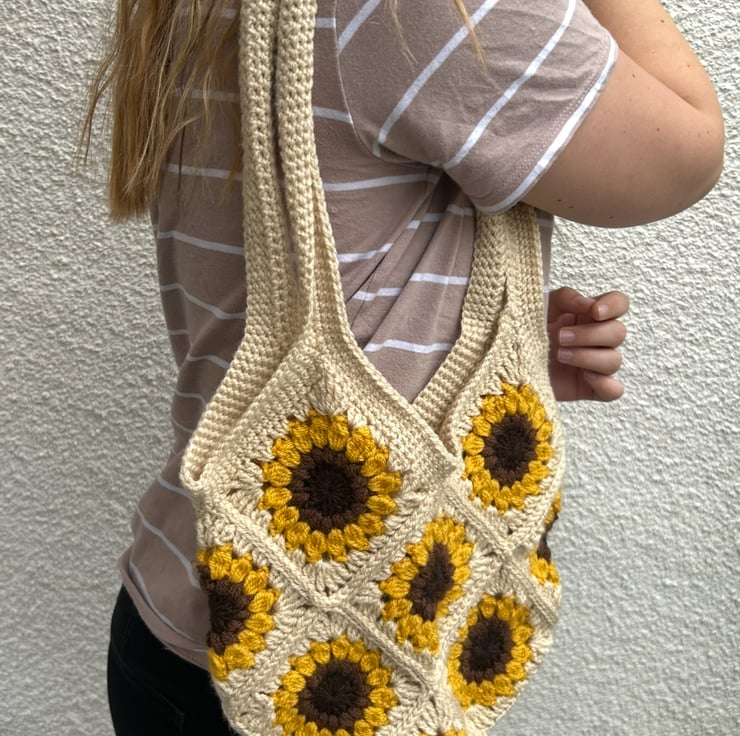 Brighten up your day with this handcrafted crochet tote, featuring charming sunflower motifs in warm golden tones on a soft neutral base. It’s roomy enough for your daily essentials and designed with a relaxed, easy shape you’ll love carrying. With its long, comfortable straps, this bag is a simple, stylish choice for everyday use.