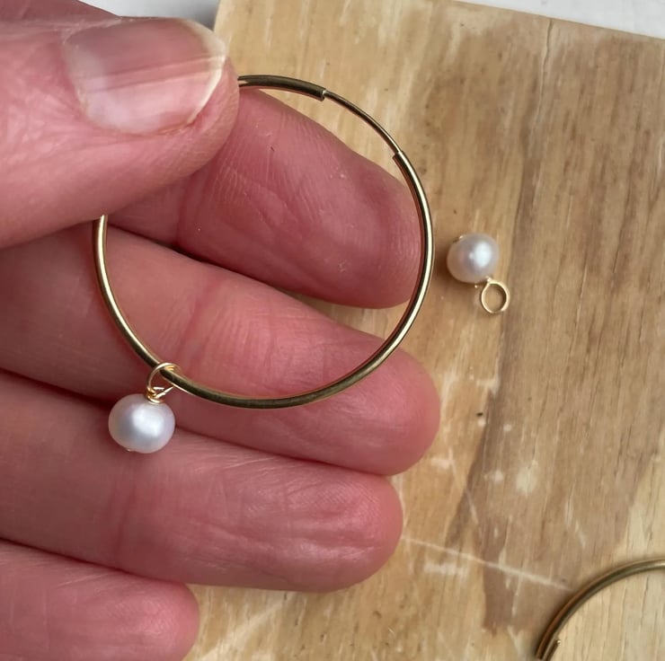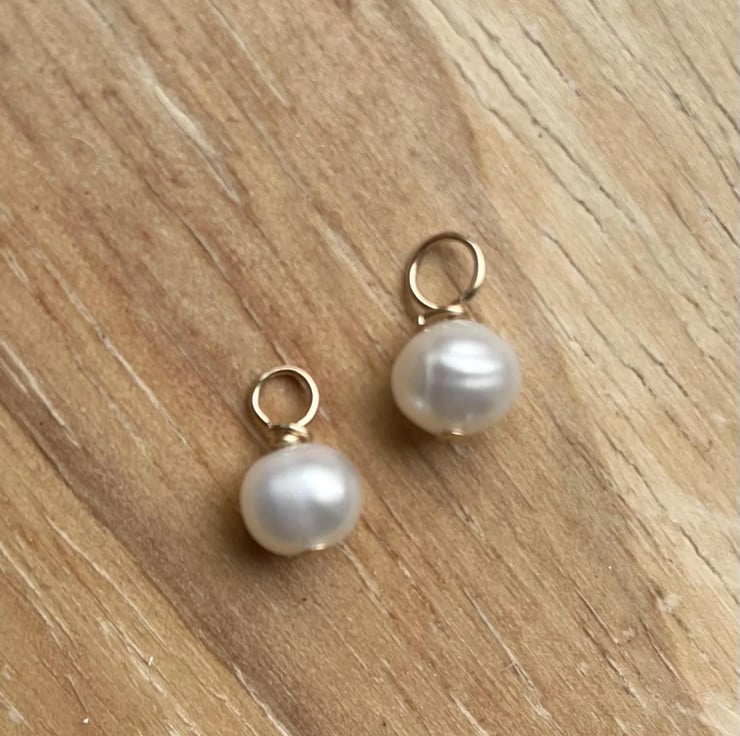 Charms only. Image with the hoops is only to show what they would look like on sleeper style hoops, A potato freshwater pearl, size approx 5-6mm with a 9ct gold loop to attach to sleeper style hoops. May also slide onto a necklace chin if the clasp or fastening is not too big. Sold in pairs, with free organza gift pouch.