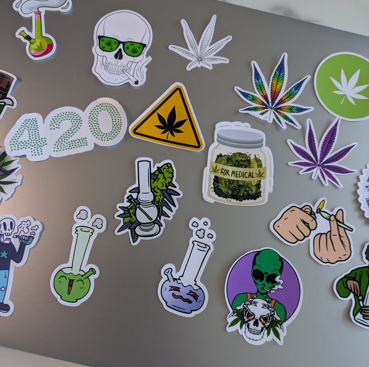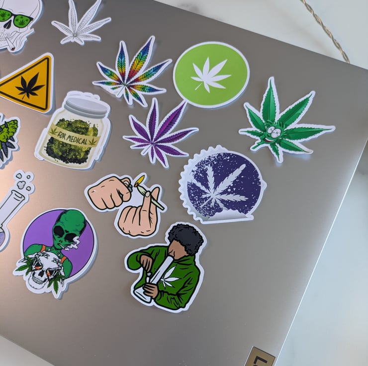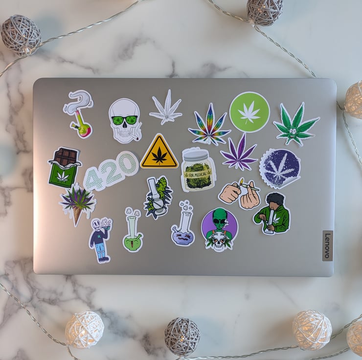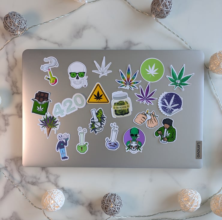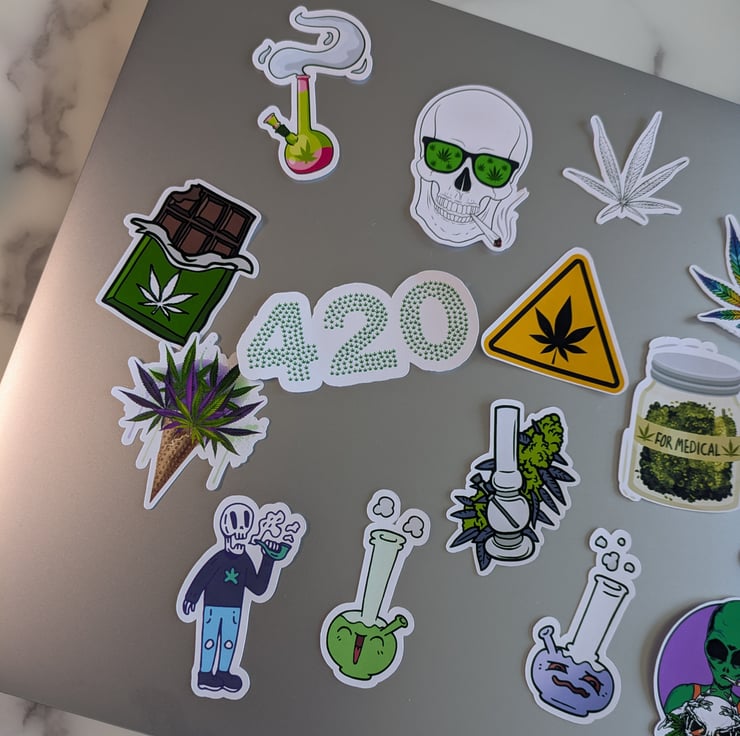 A curated pack of 20 cannabis and 420-themed stickers. Perfect for laptops, water bottles, skateboards, phone cases, luggage, notebooks, journals, tablets, and gifts.