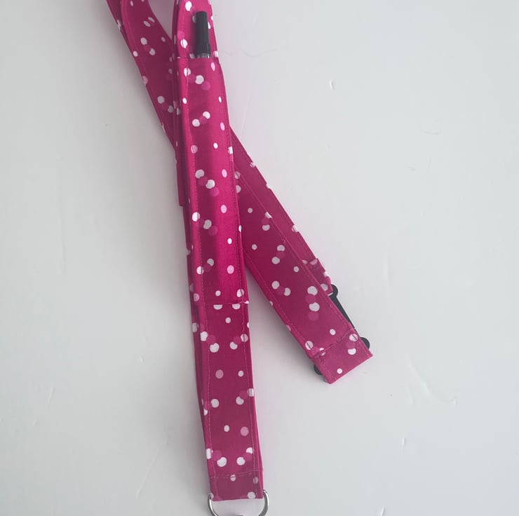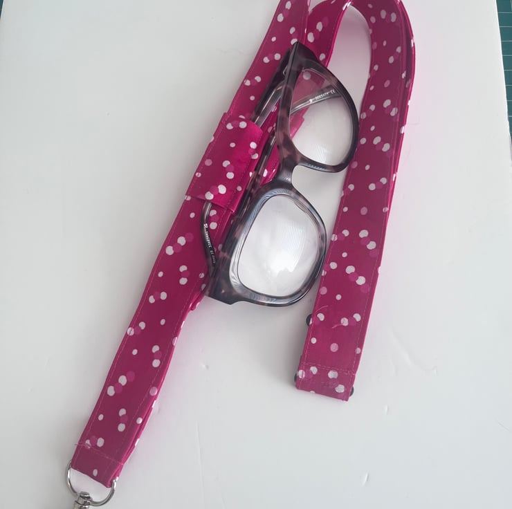 Pure cotton lanyard with a narrow pocket for a pen and a tab you can slip the arm of your glasses through, plus a lobster swivel clasp for an id card or keys.