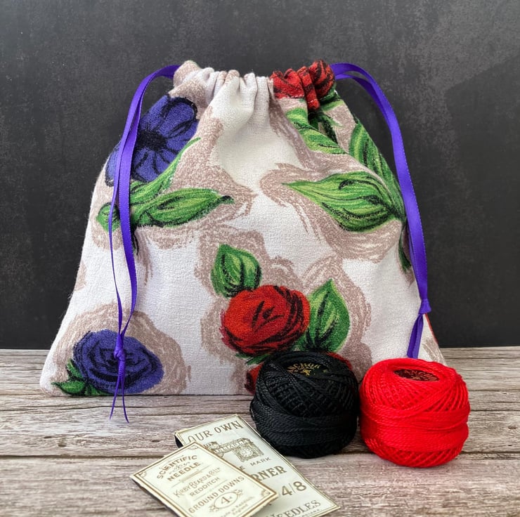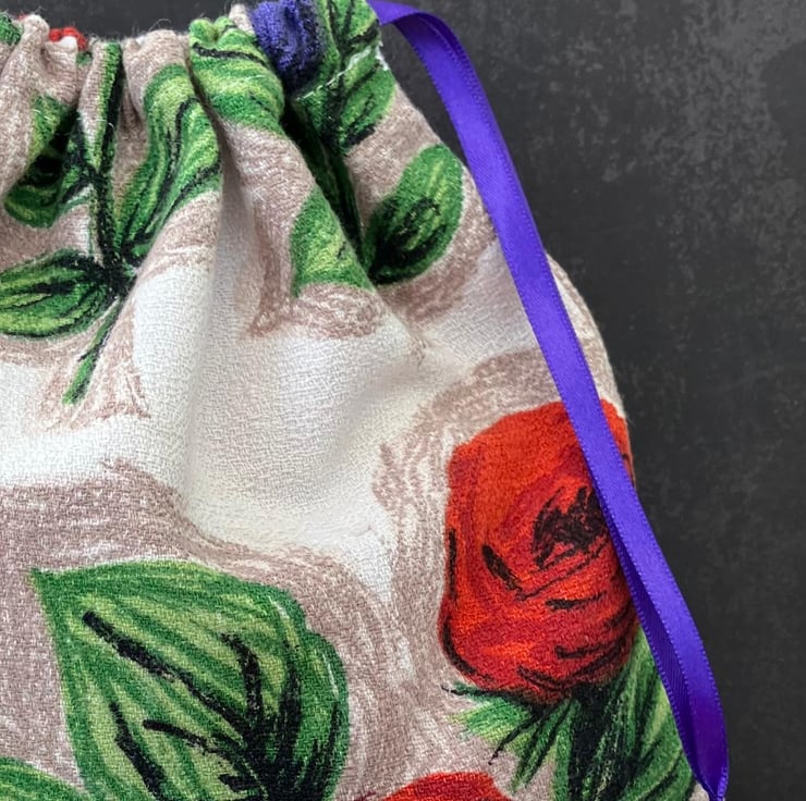 1950s Vintage Barkcloth Drawstring Bag, Red Roses, Purple Flowers, Purple Ribbon