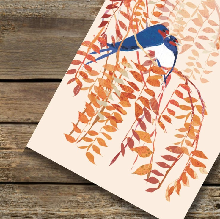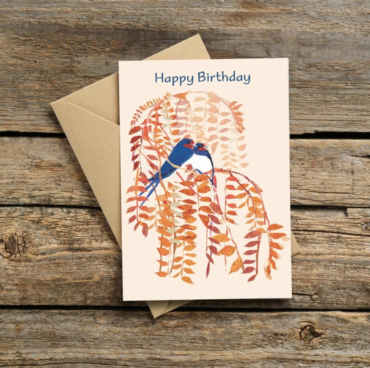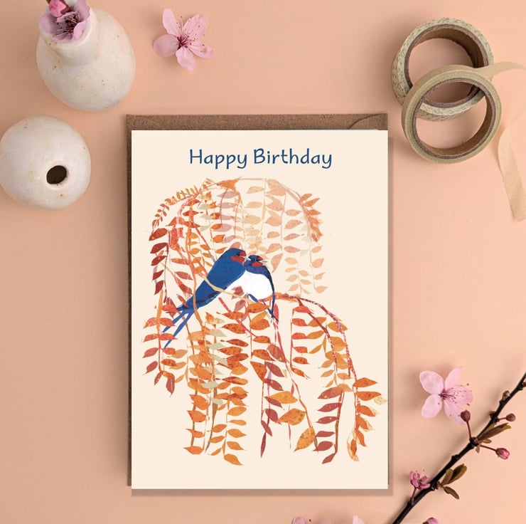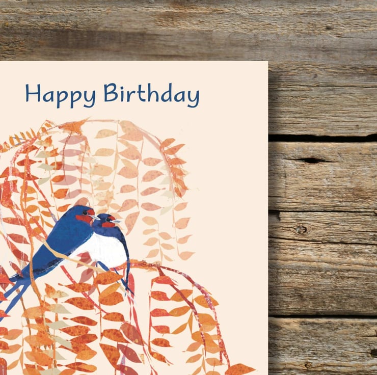 A beautiful illustration of Swallows perched in a tree perfect birthday card for friends, family or colleagues. Blank inside for your own message.