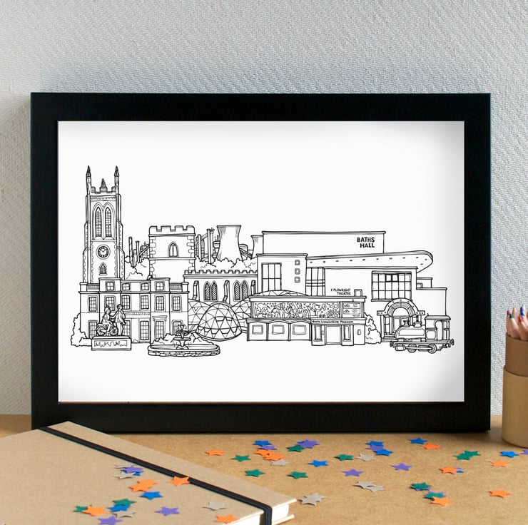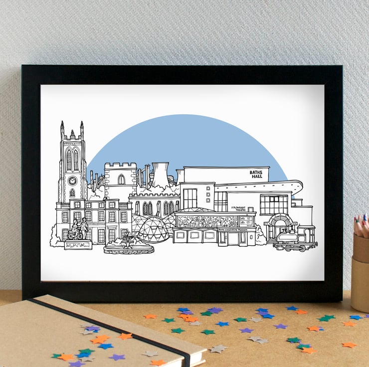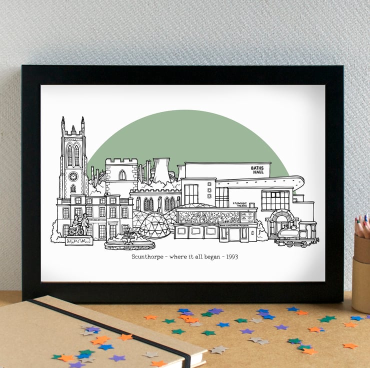 A pretty print of my skyline illustration of the most famous landmarks in Scunthorpe.