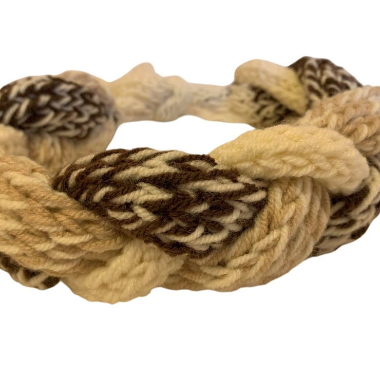 Made from curated DK yarn in complimenting shades of brown and cream.