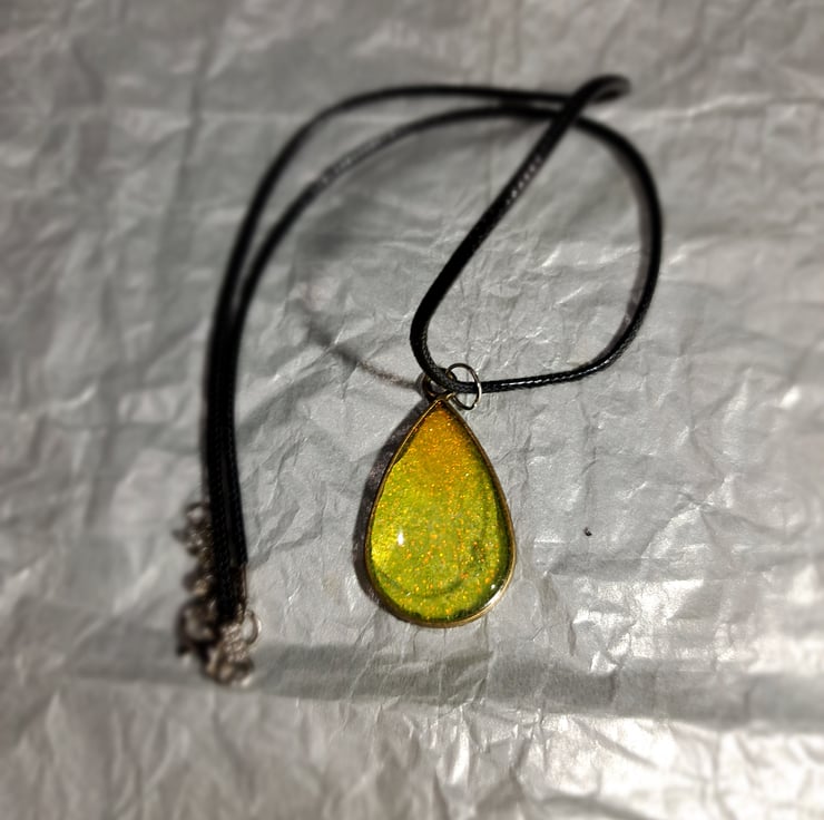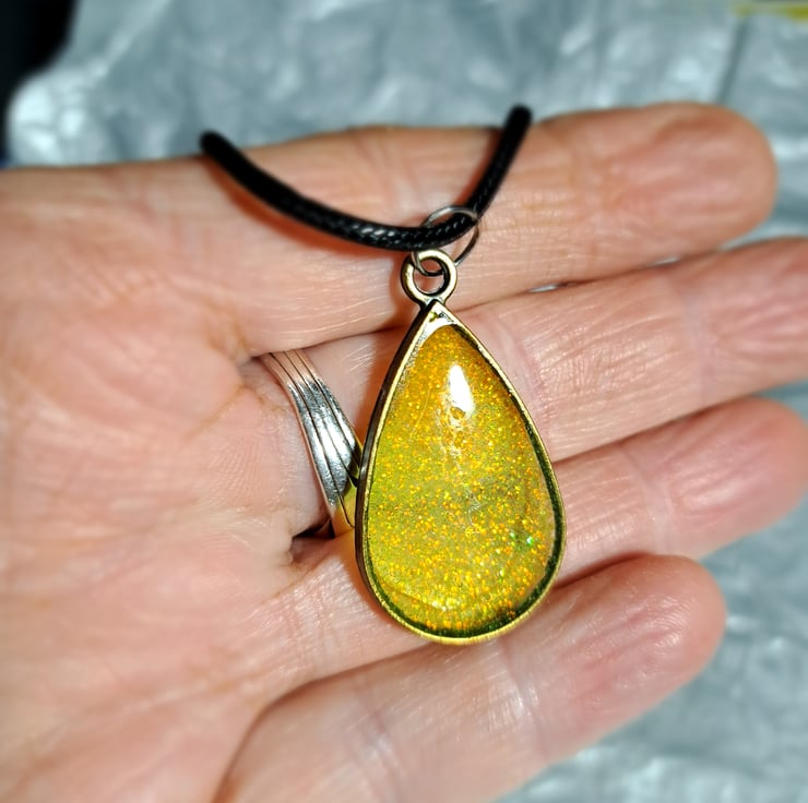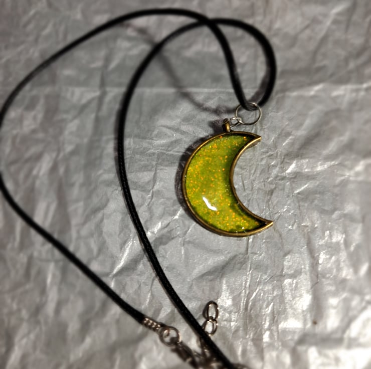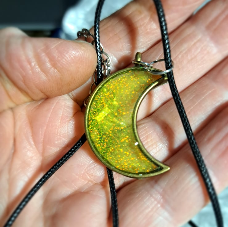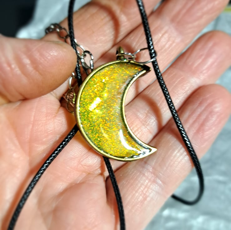 A lovely sparkly yellow/gold resin filled teardrop and crescent moon pendant, handmade.