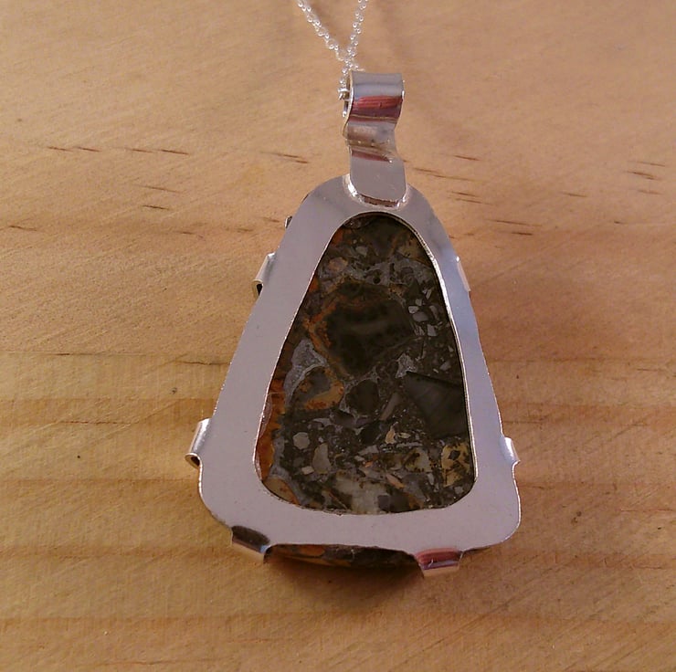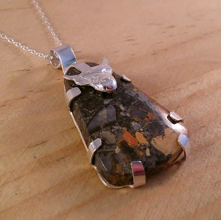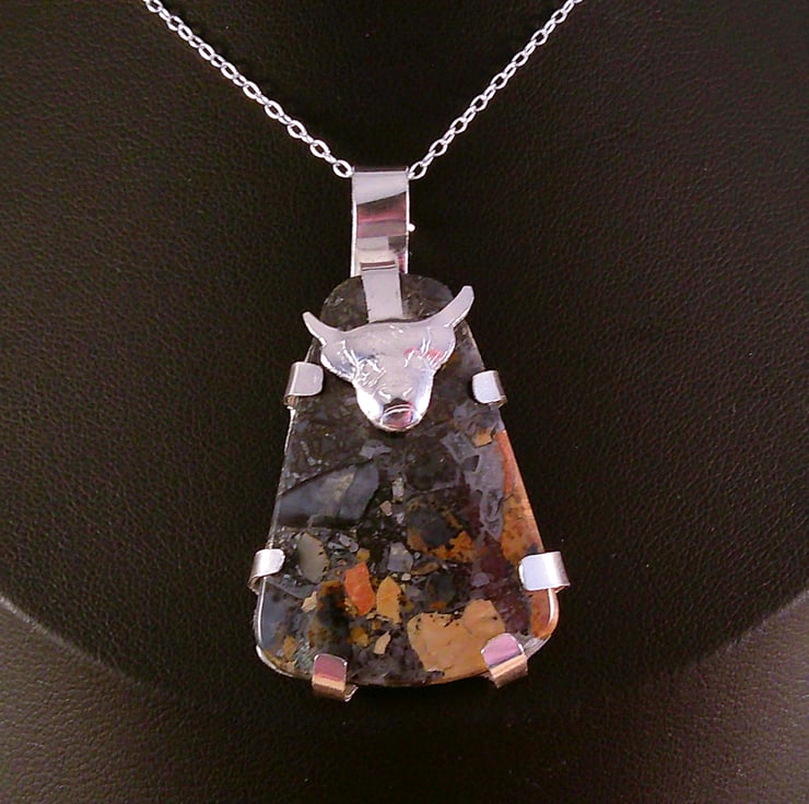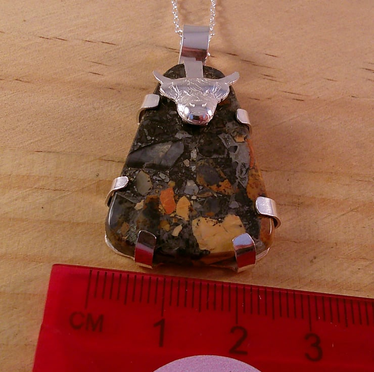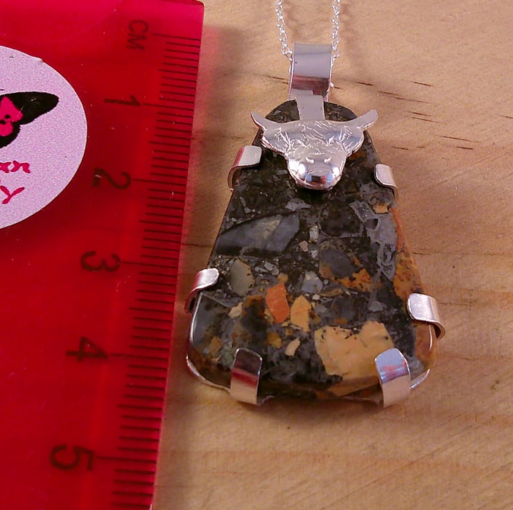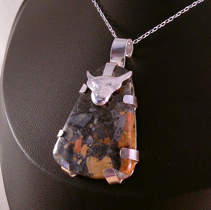 An unusual statement necklace featuring a triangular shaped Maligano Jasper gemstone and a small Highland Cow. The perfect gift for farmers or any Highland Coo lovers!