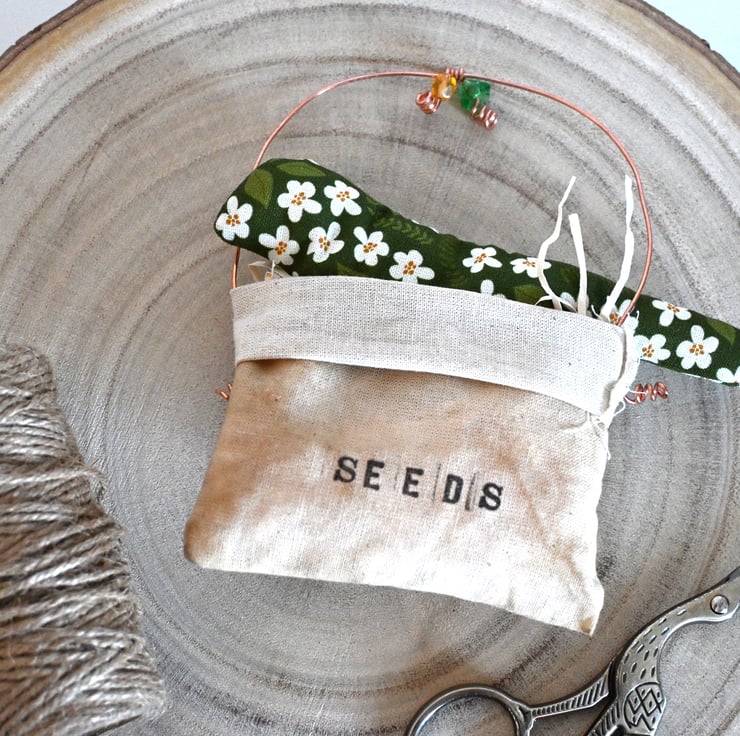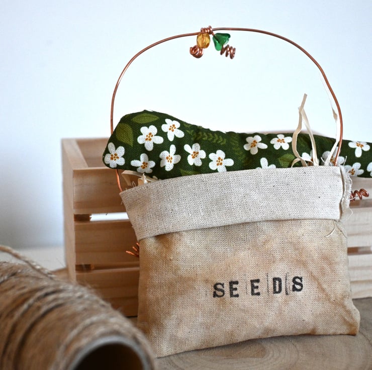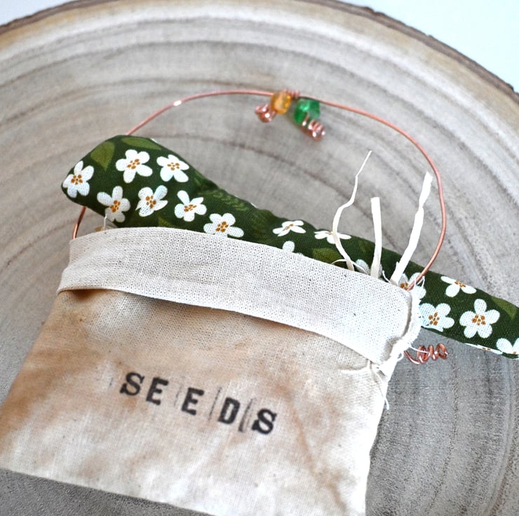 A bird seed bag hanger which has been stained to give a primitive feel and stamped with the word 'seeds'. It has a copper wire attached to hang it with a green glass flower bead and a small round yellow glass bead.