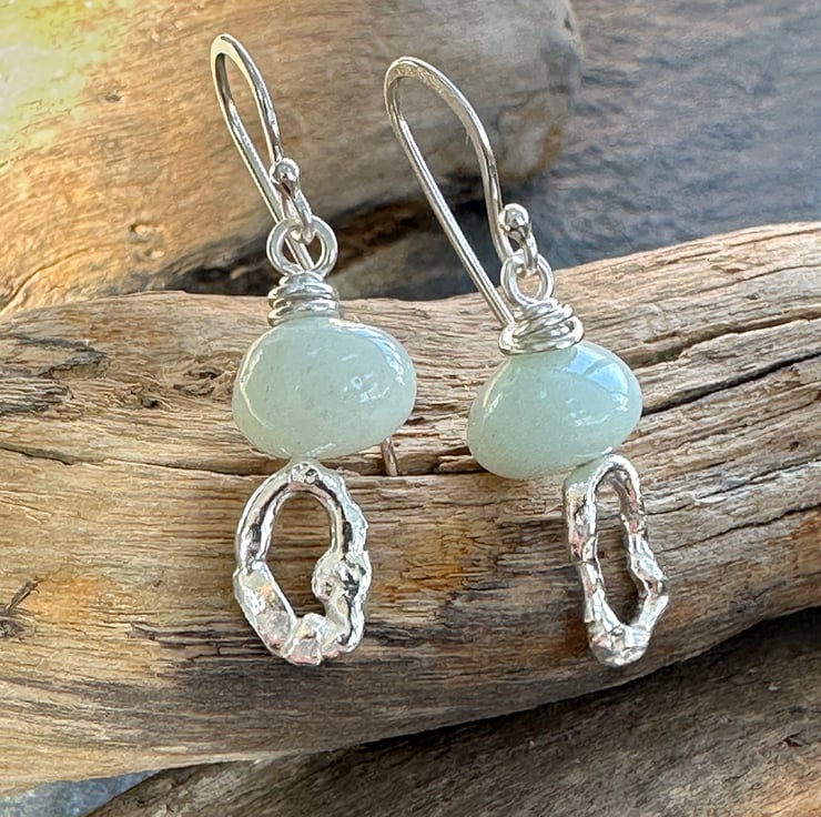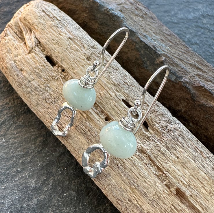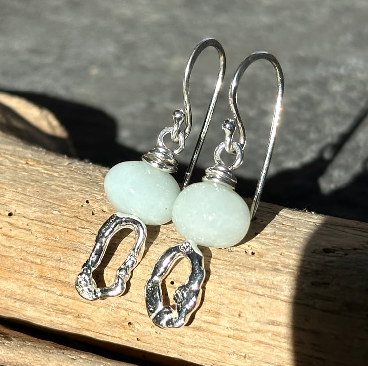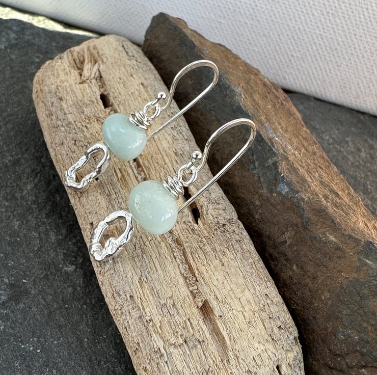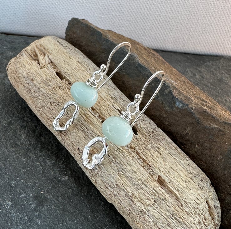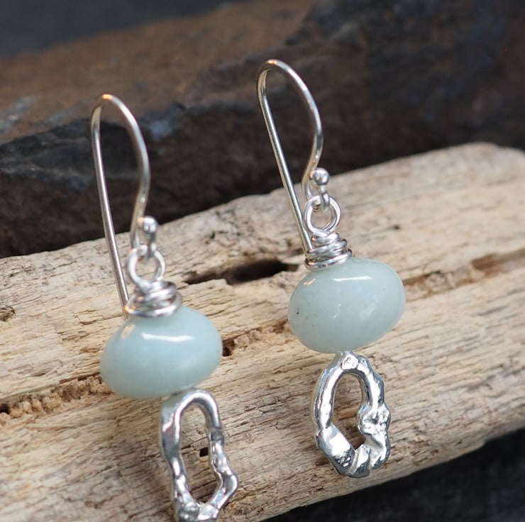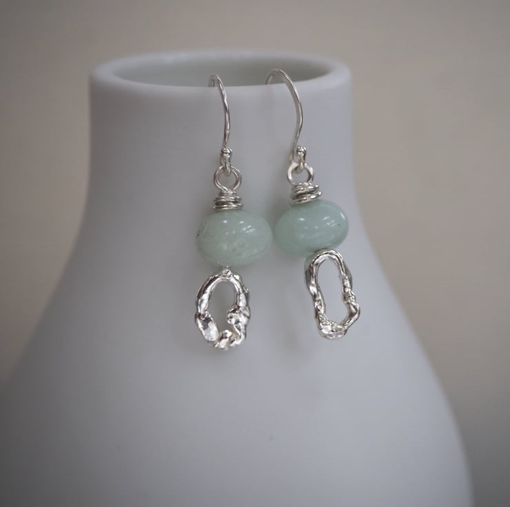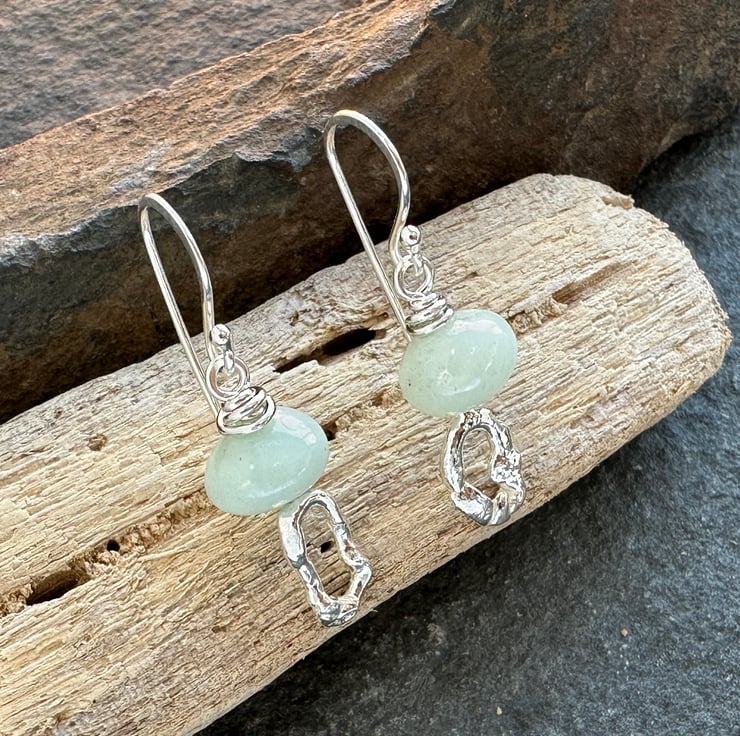Slightly mis-matched molten silver earrings topped with hand cut amazonite nugget beads. Great little earrings from everyday wear they would make a lovely unique gift.