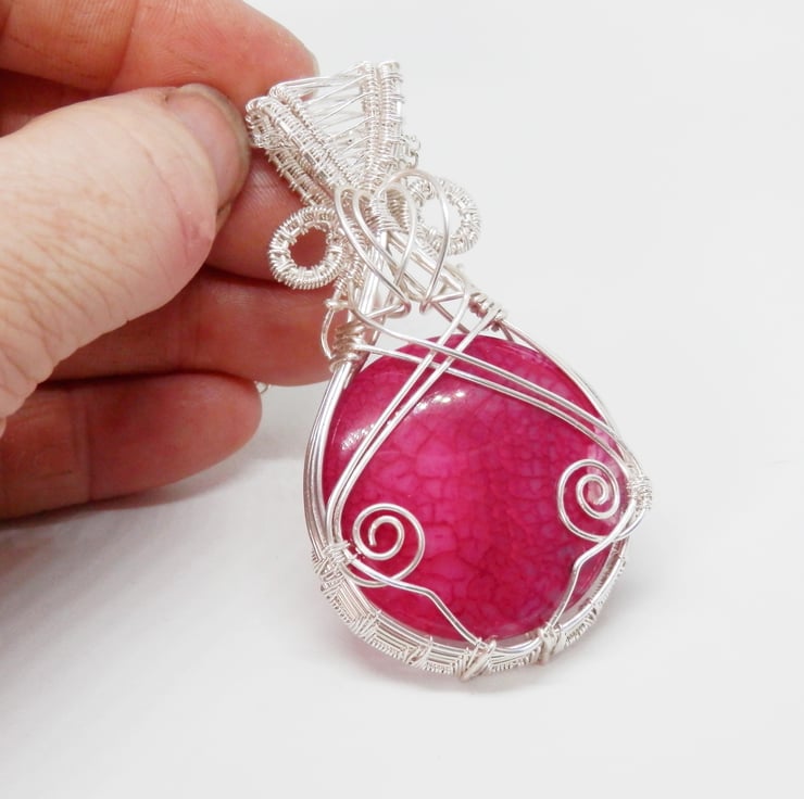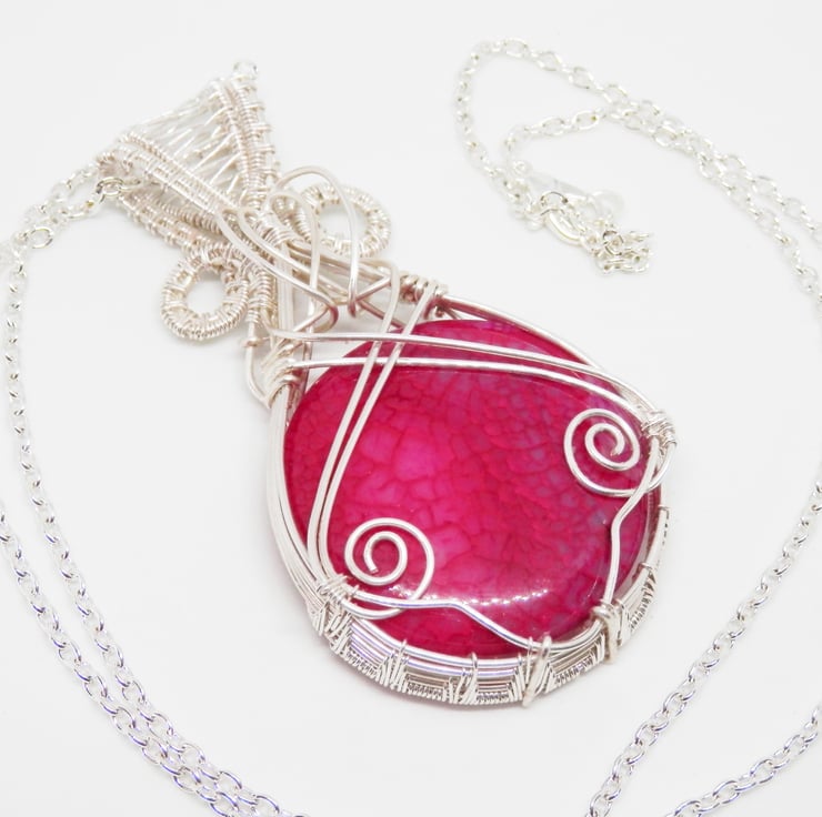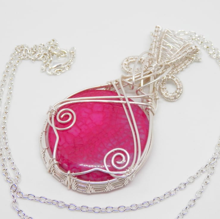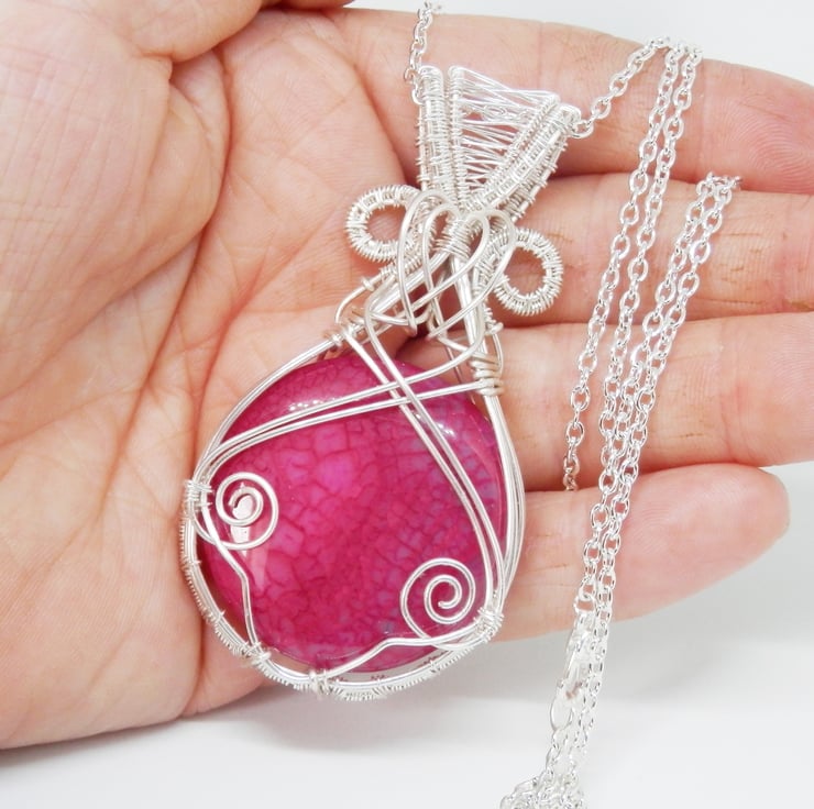 This is a beautiful wire wrapped Necklace, made using Silver Plated wire that has been wrapped lovingly in a Celtic Style around a circular shaped piece of Pink Dragon Vein Agate. I have added swirls, a heart shaped wire focal and a fancy bail.