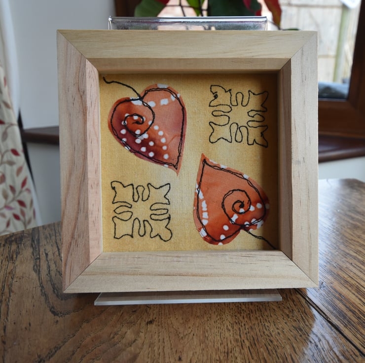 1. An Indian inspired textile design presented in a square light wooden box frame.