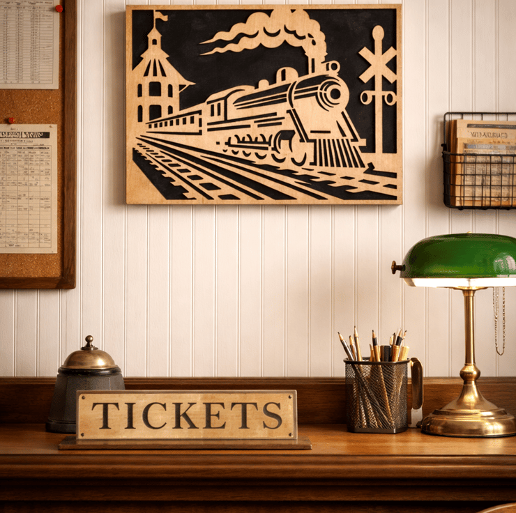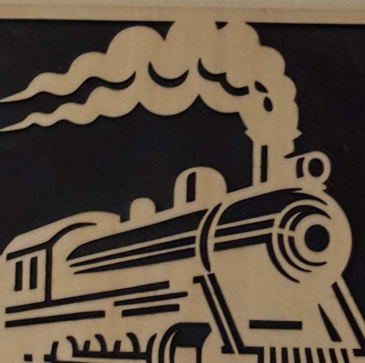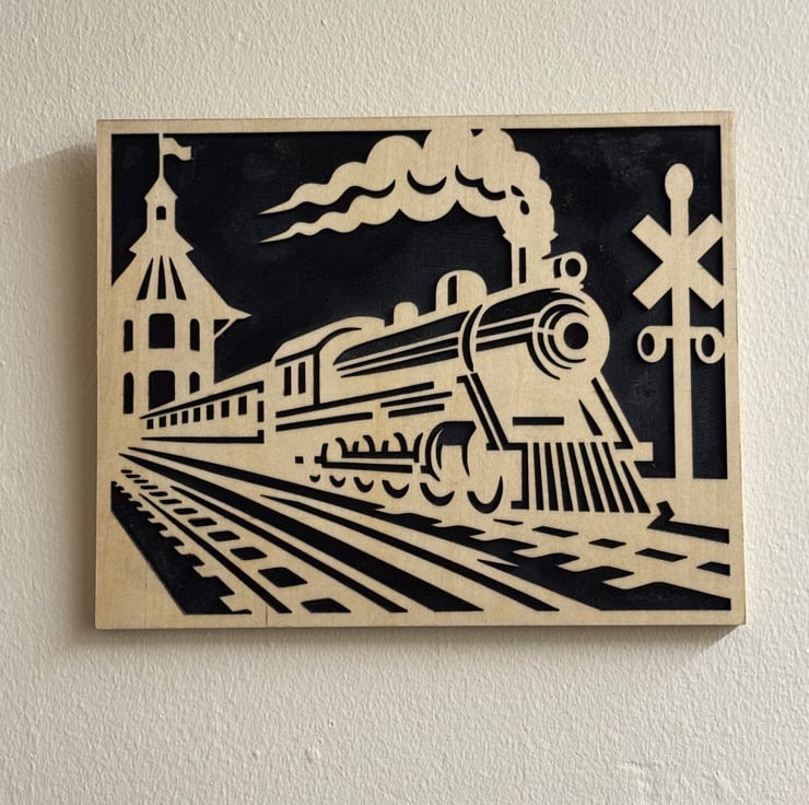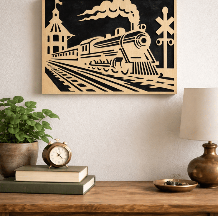 This piece features a striking laser cut design of a classic steam locomotive pulling into the station, complete with track detail, signal and billowing smoke. The natural wood top layer contrasts beautifully against the dark background, giving the artwork a bold and eye-catching finish.