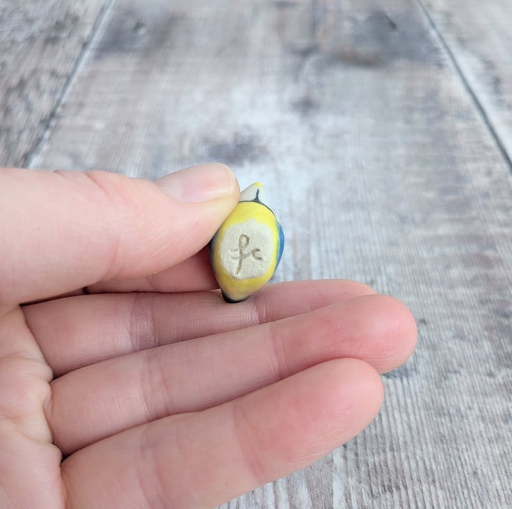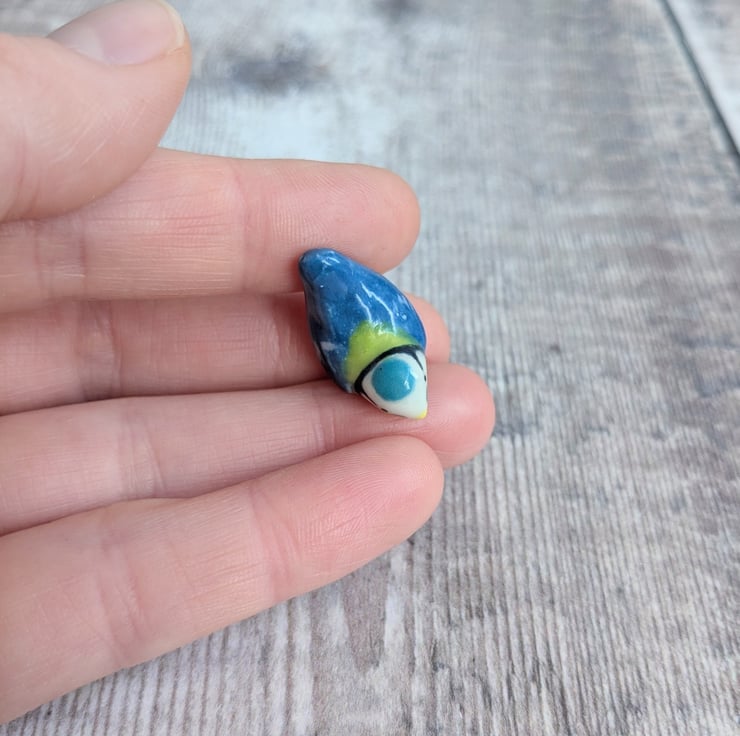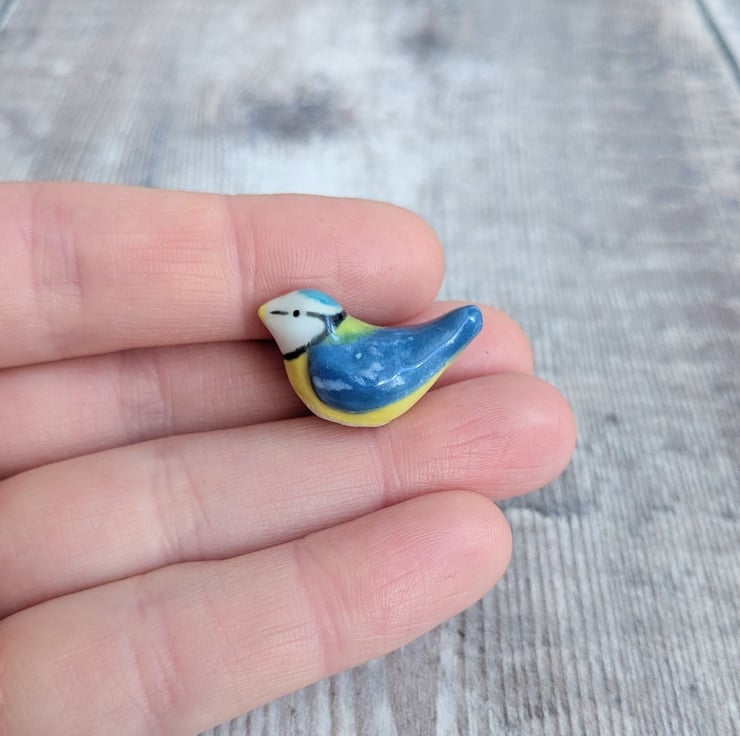A tiny ceramic blue tit figurine, sculpted from from white stoneware clay. It measures about 1.5cm and is hand painted with a clear glaze.
