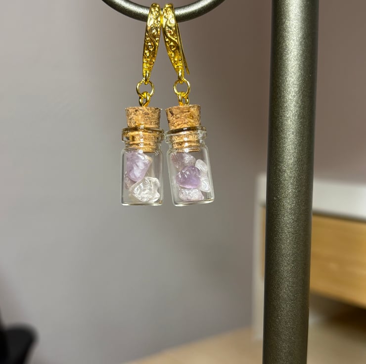 Miniature glass potion bottles filled with rose quartz and quartz crystal chips