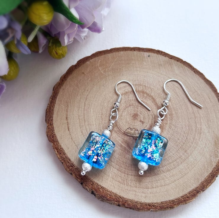 Add a sparkle to your outfit with these Light Blue Dichoric Glass Beaded Earrings.