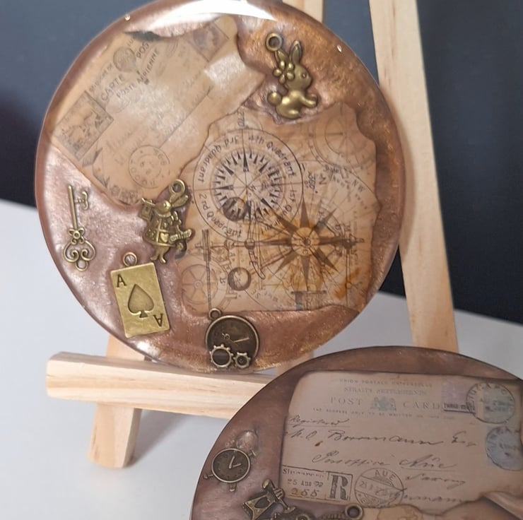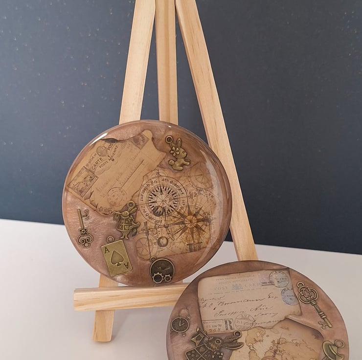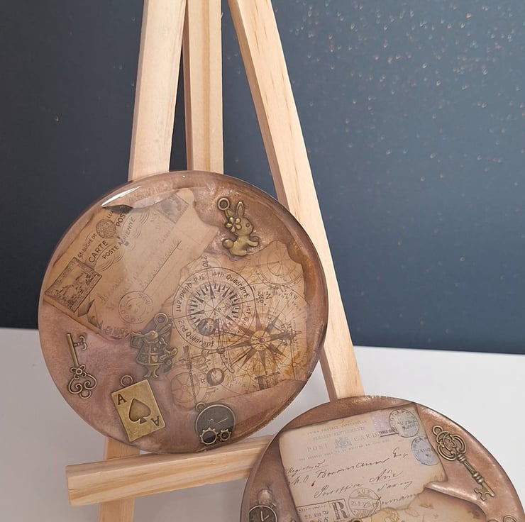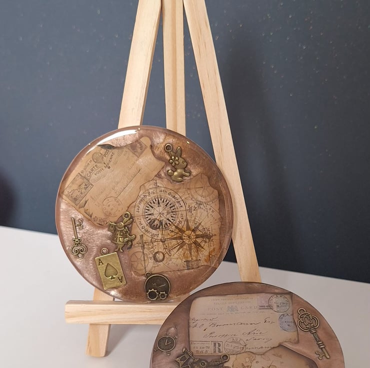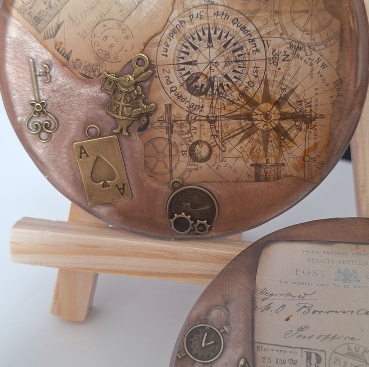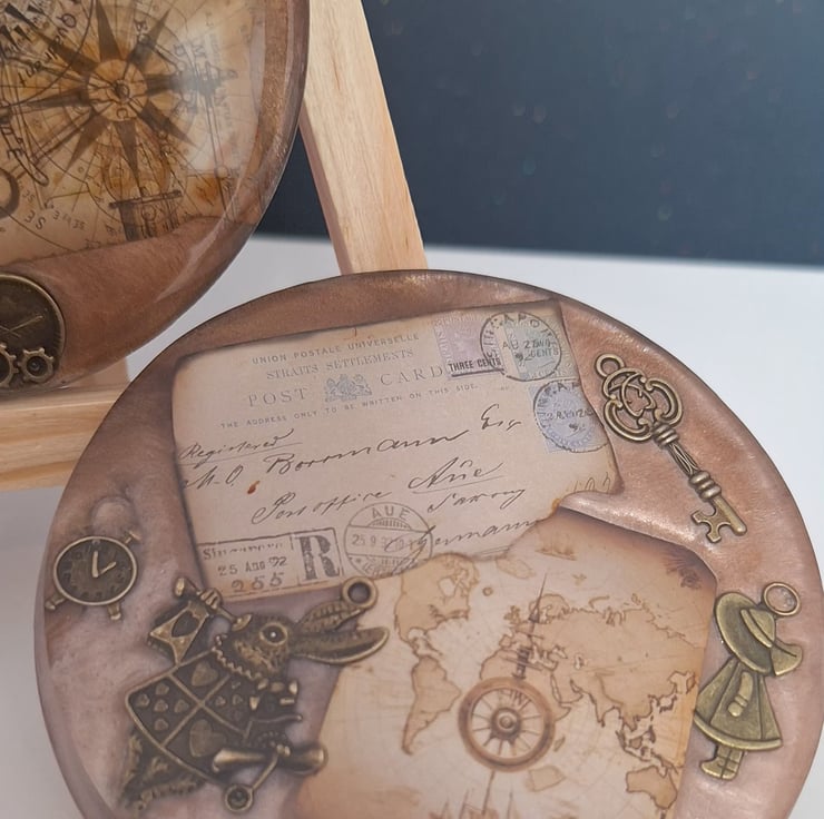 SOLD Lose yourself in the details of these vintage-inspired coasters. Featuring antique cartographic backgrounds and detailed bronze charms, these pieces bring a touch of Victorian whimsy to your coffee table.
