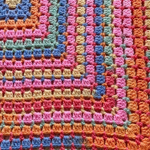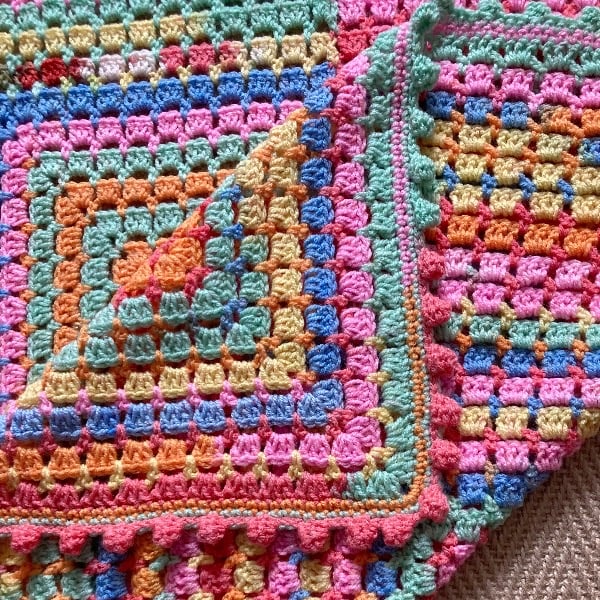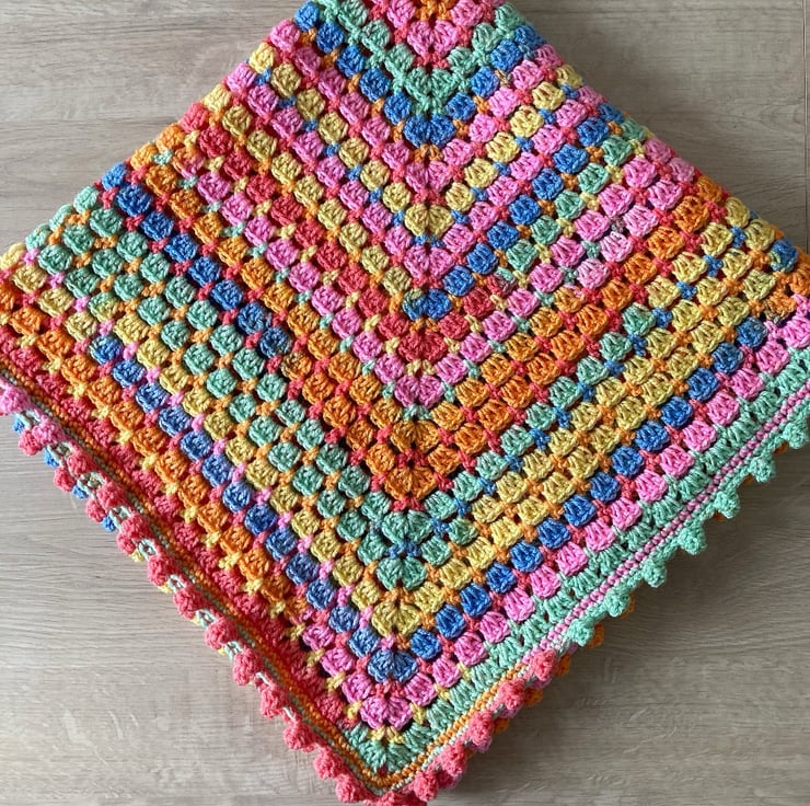 I think the bobble edging adds another element of fun to this granny square blanket along with the bright colours. Would be perfect as an extra layer in a buggy/pram, or used as a play mat for tummy time!