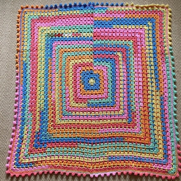 My go to calming project is usually a simple granny square blanket, I had this yarn in my stash and thought it would be perfect…..and I love a bobble edging!
