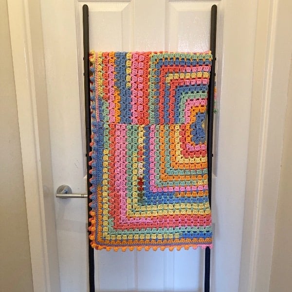 This fun brightly coloured baby blanket has been crocheted in 100% Premium Acrylic, it is machine washable on 30 deg but do NOT tumble dry