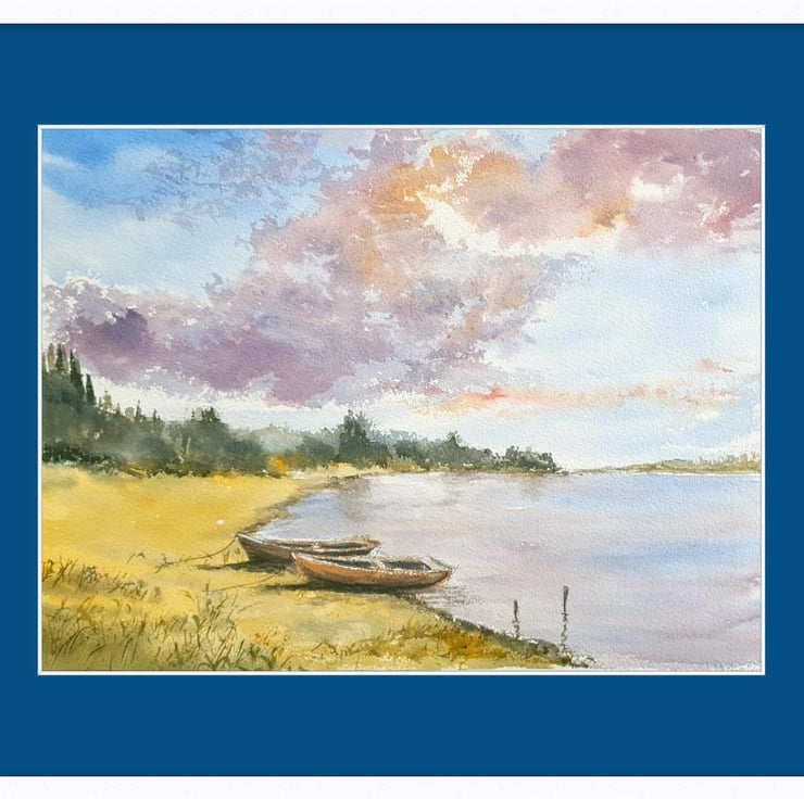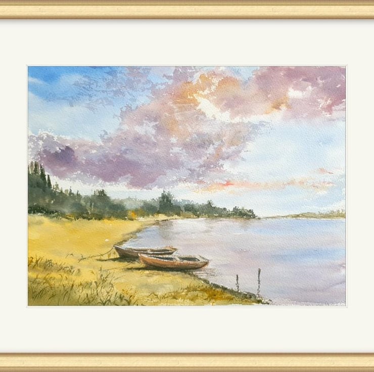 Original Watercolour Landscape .Summer Clouds and Boats . 15x11 inches ,unframed