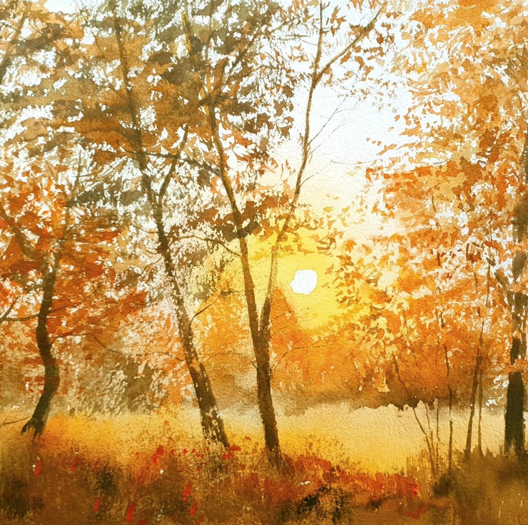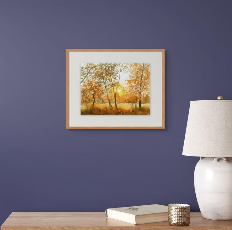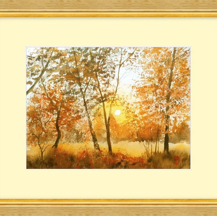 A golden glow suffuses this painting , depicting the sun setting through the autumn hues of the fall foliage