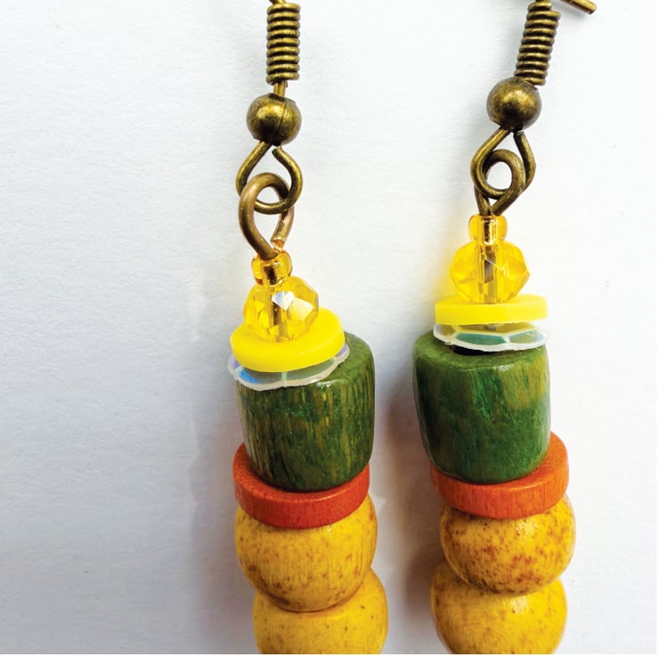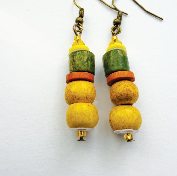 Yellow orange and green beaded boho style dangle drop bead earrings handmade using up-cycled and shop brought beads.