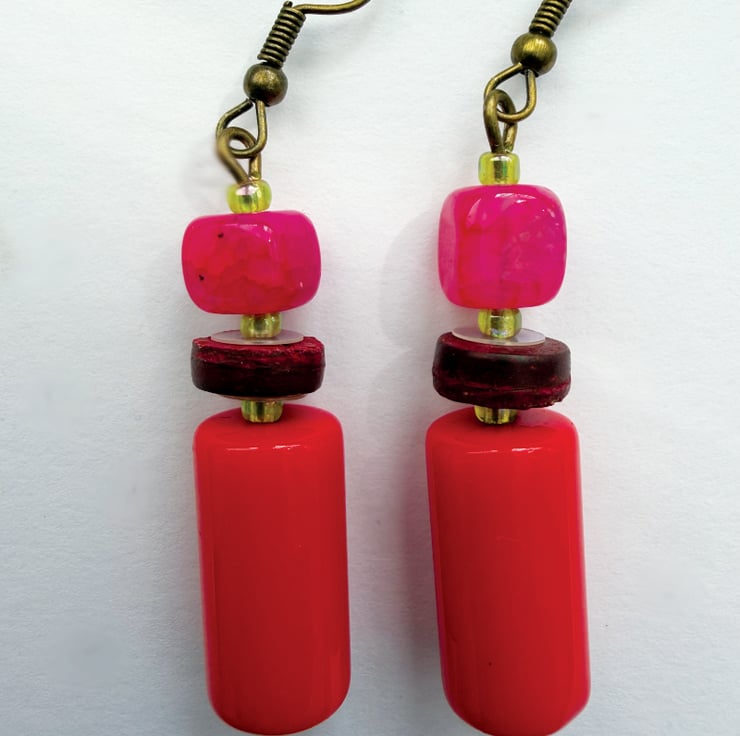 Red cerise pink and brown dangle drop bead earrings handmade using up-cycled and shop brought beads. Has a slight weight to them.