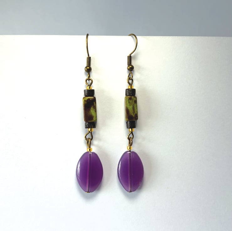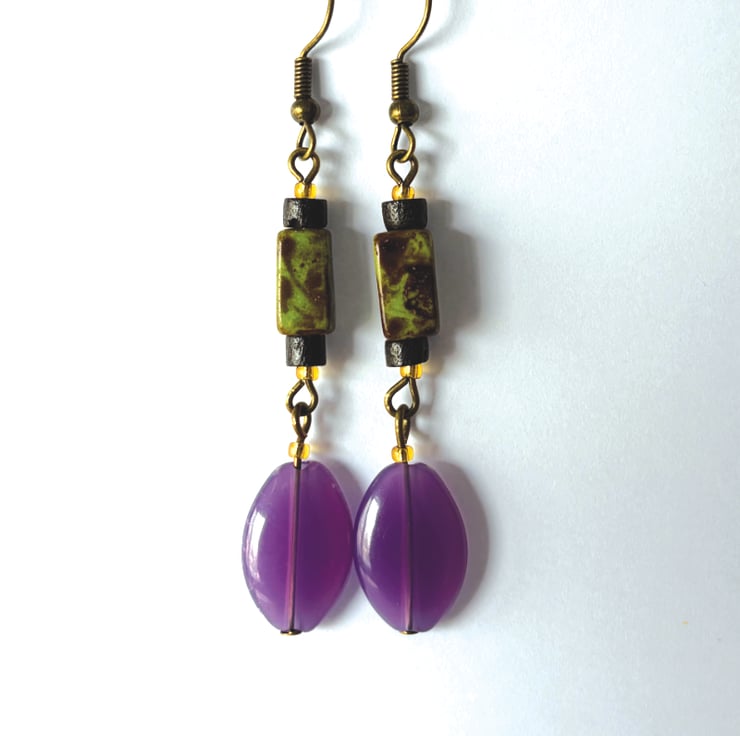 Purple oval, black and green drop bead earrings handmade using up-cycled and shop brought beads.