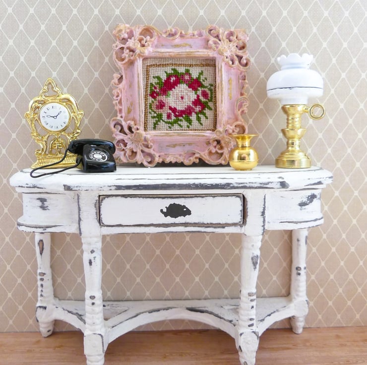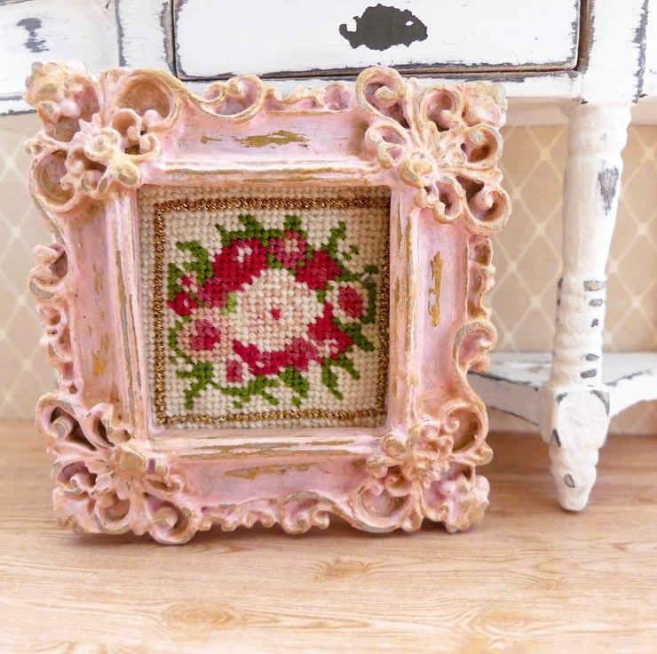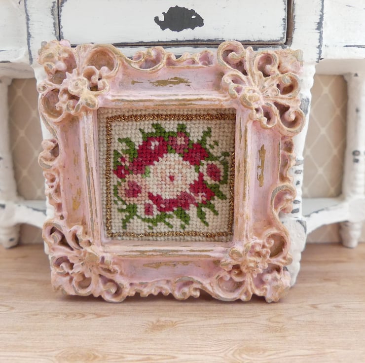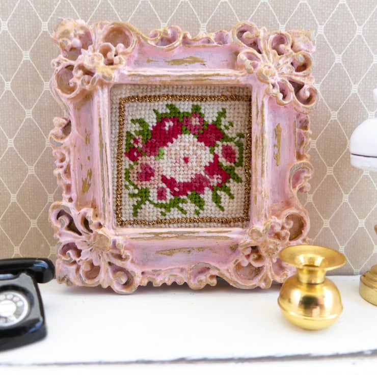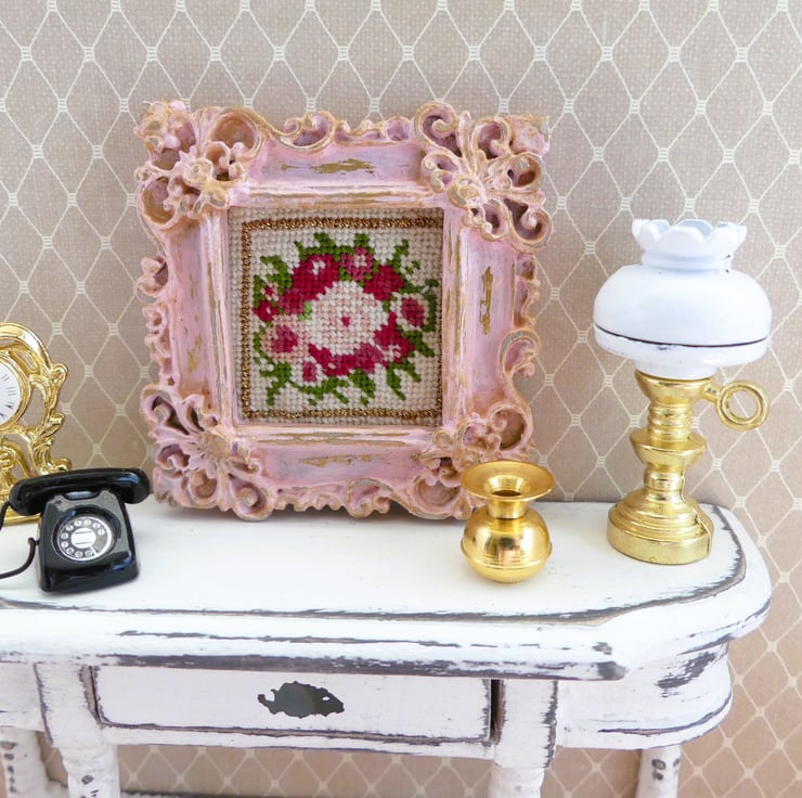 Set inside an ornate, vintage-style frame with a distressed pink finish, this tiny piece adds a charming touch to any space. Perfect for dollhouses, shelf decor, or lovers of cottagecore and shabby chic style.