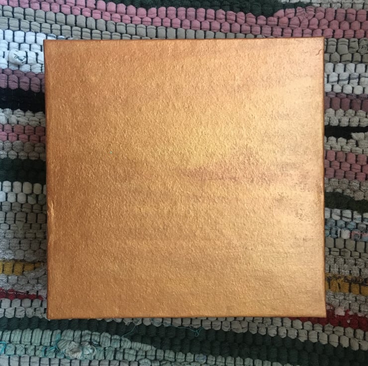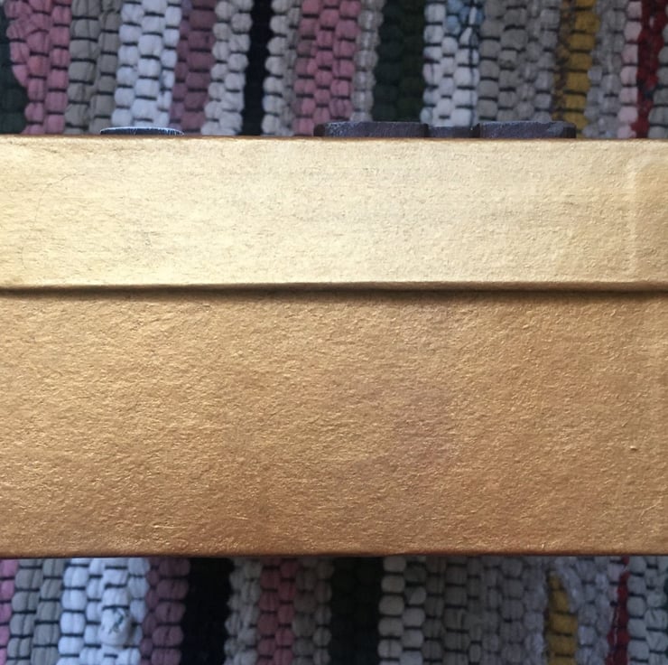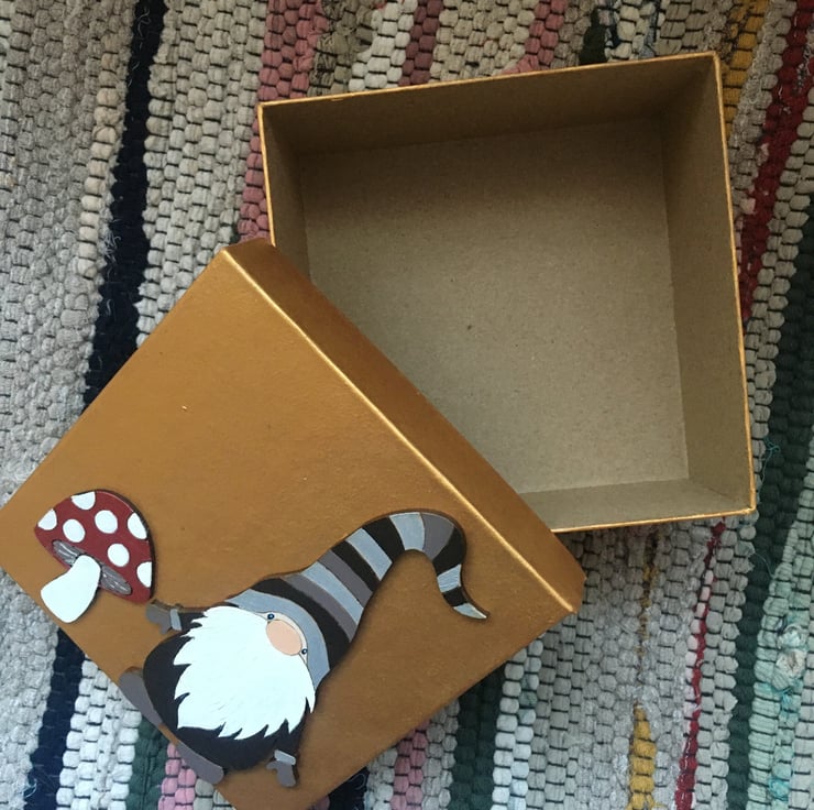 Firm cardboard box measuring 5 inch square (13.5cm) painted gold and featuring a wooden gnome painted in shades of brown and white accompanied by his toadstool.