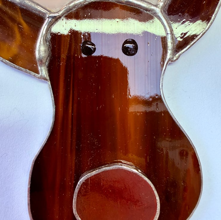 This stained glass reindeer decoration is made from streaky caramel brown glass for the face and ears, paired with lighter buff brown glass for the antlers. A bright red nose is added to complete the design. The eyes are hand painted using specialist glass paint. Other colour variations are available in separate listings.