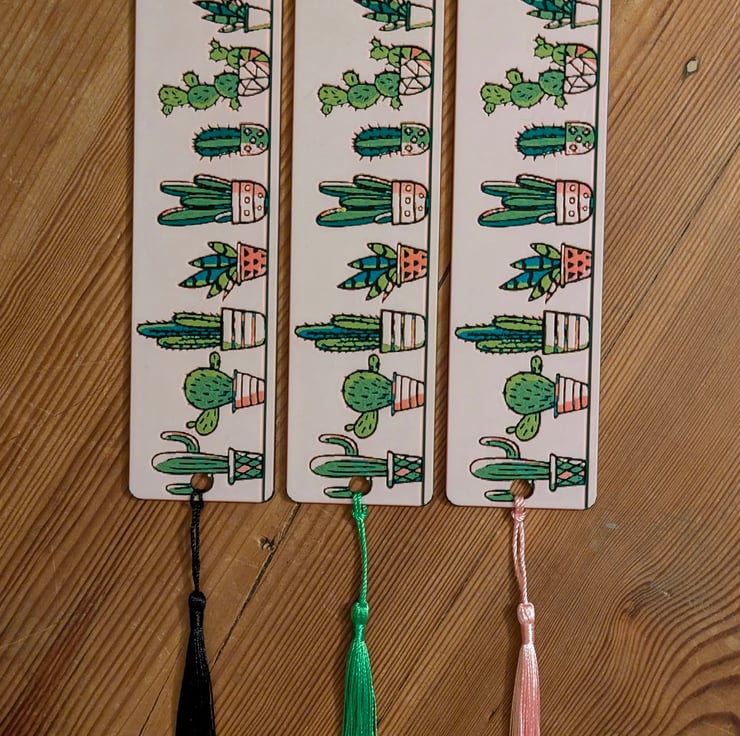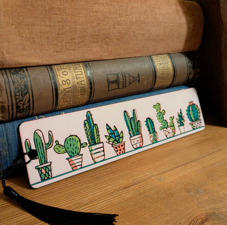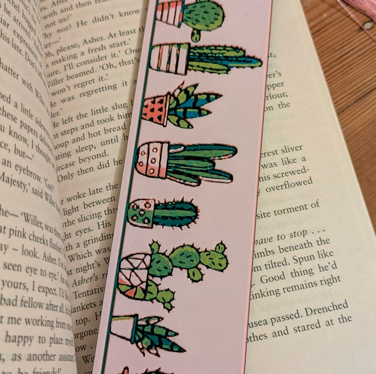 A cactus bookmark (Cacti?) with vibrant detail and a light pastel pink tone. This was designed and made by me at home using photo stock and digital manipulation before being 3D printed for a unique, textured finish.