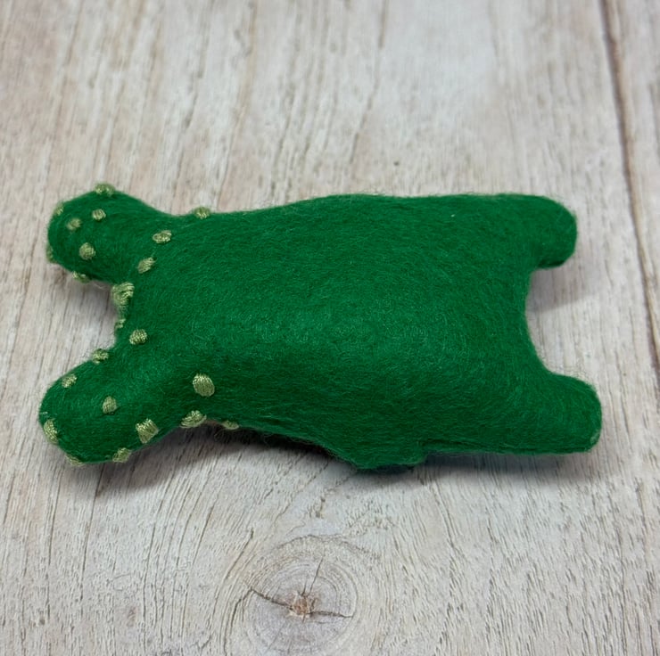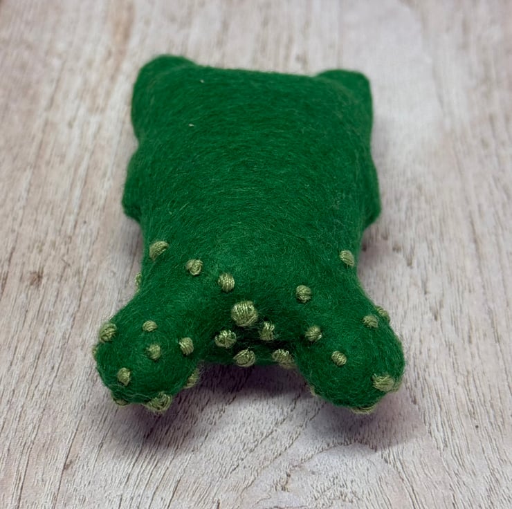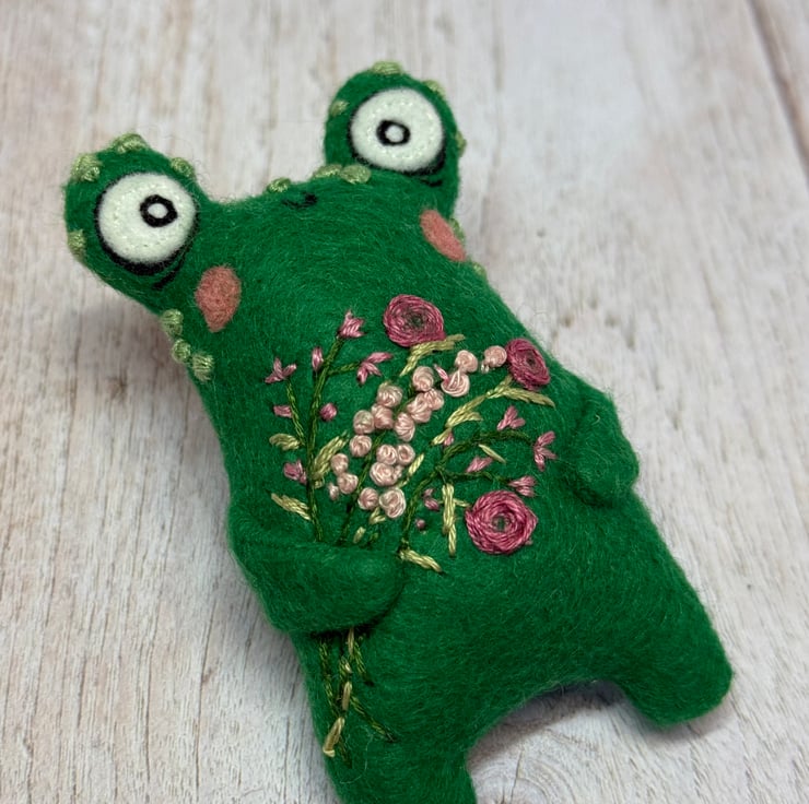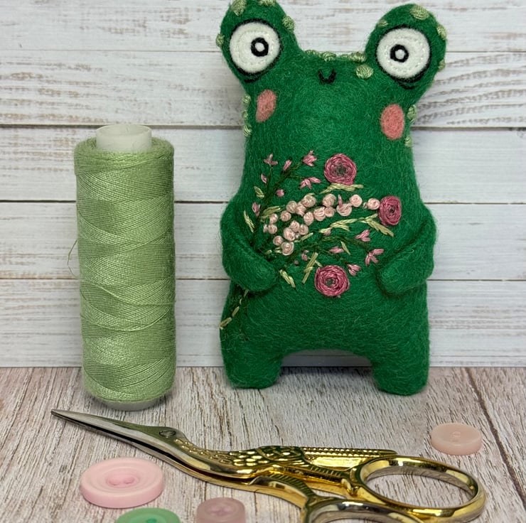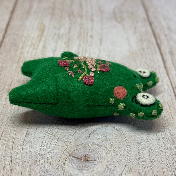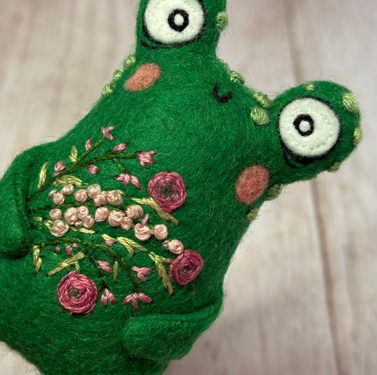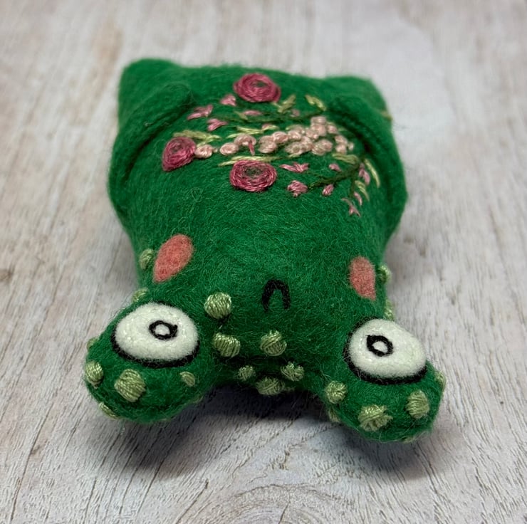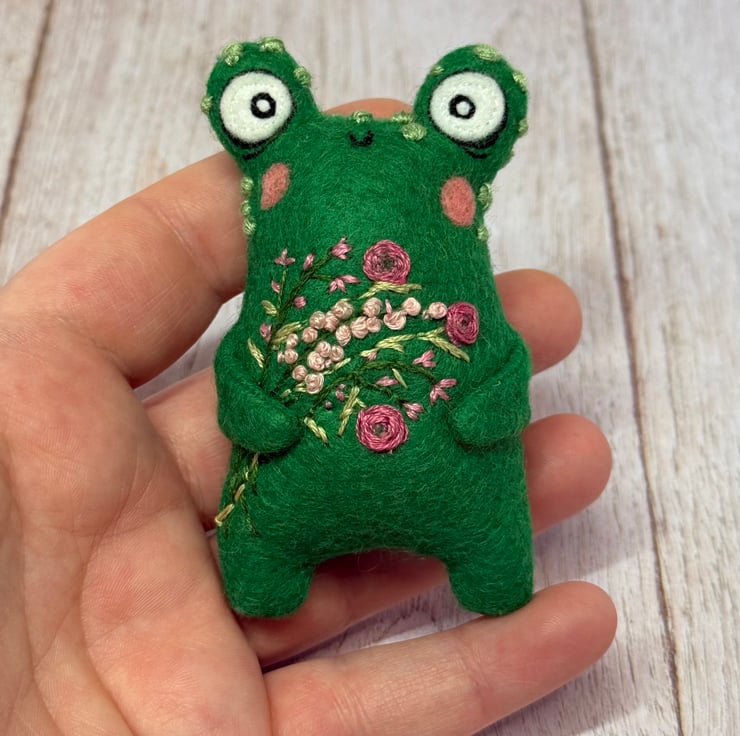 Felt art doll with free motion embroidered eyes and smile. This frog has hand embroidered flowers in shades of pink with green leaves and spots around the face. Frog has cute needle-felted pink cheeks. Frog measures roughly 8.5cm tall. Beautifully gift wrapped and sent in recyclable or recycled packaging.