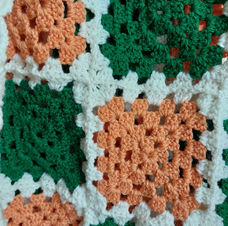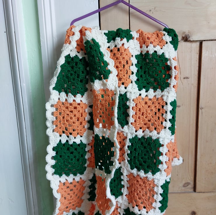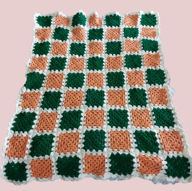 Handmade blanket size 34 inches x 32 inches approx (87 cm x 82 cm ) Orange Cream and Green colours. Ideal for baby pram or small bed.