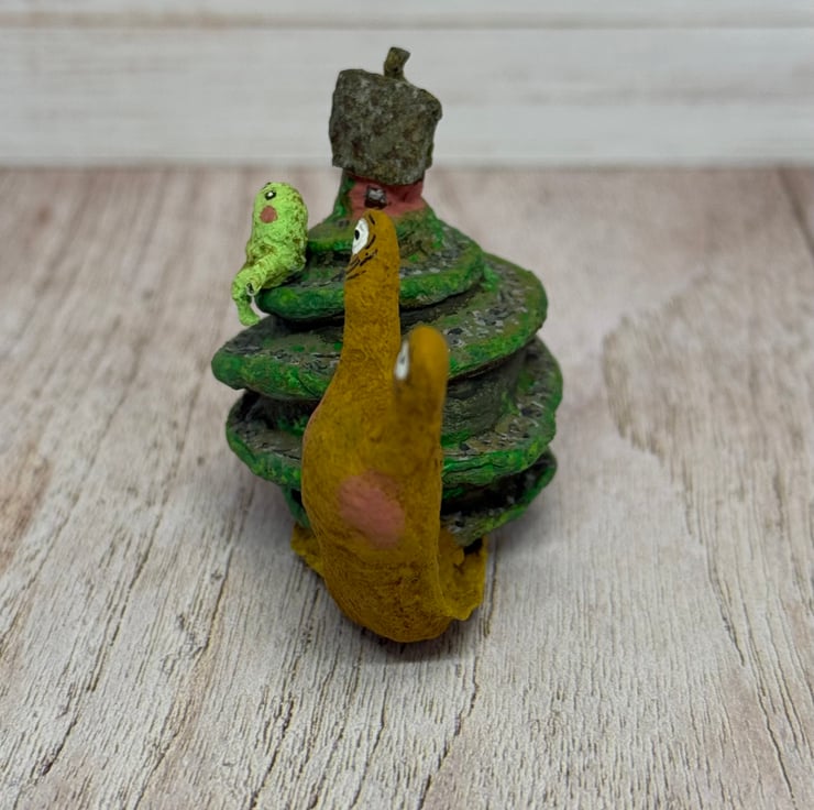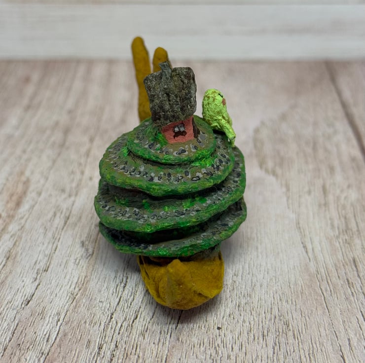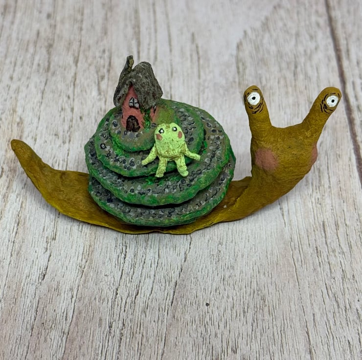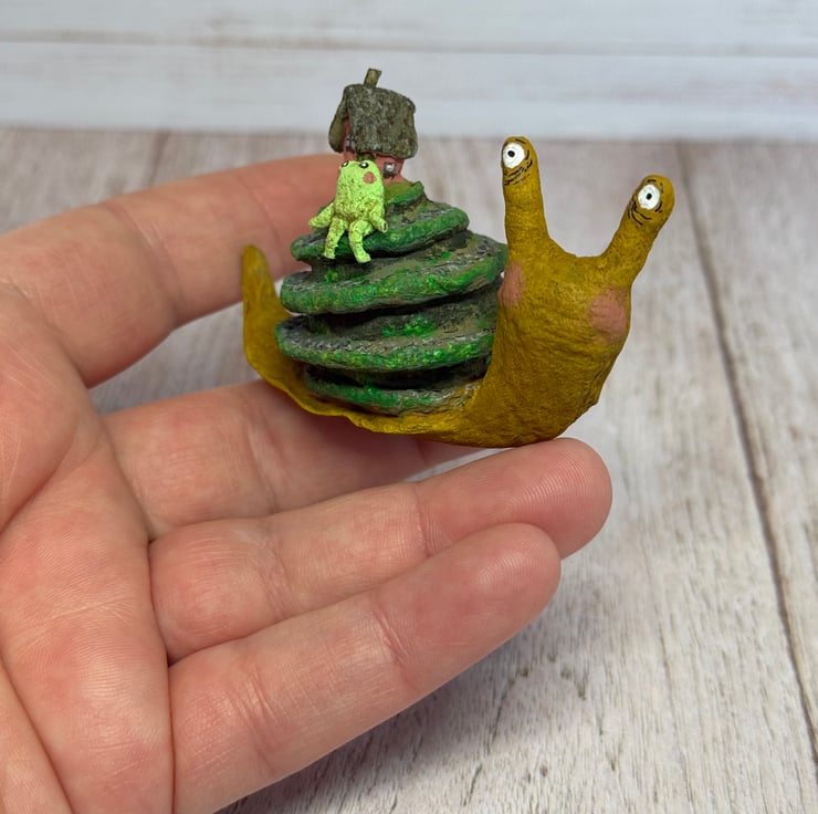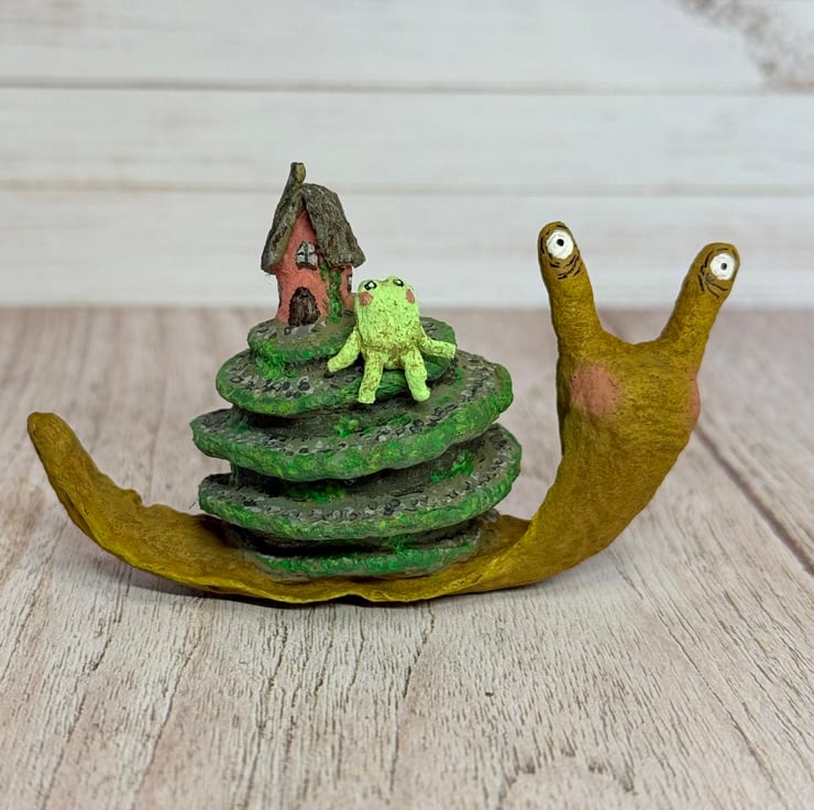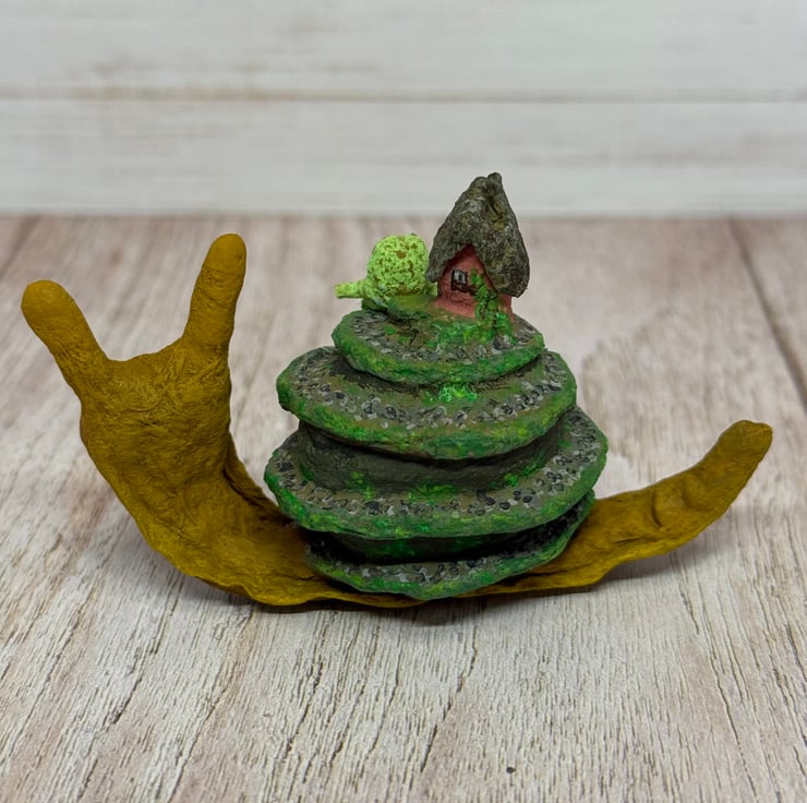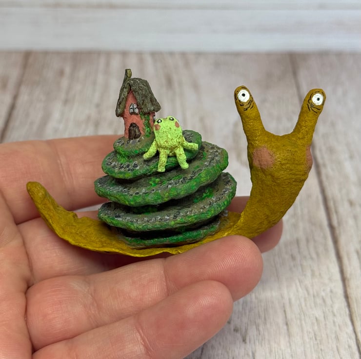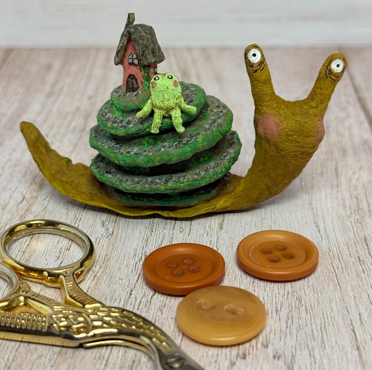 Spun cotton snail is entirely hand painted and topped with a tiny cottage and froggy friend. Snail stands unaided and measures roughly 8cm long and 5cm tall. A pebble path is painted down the swirl of the snail shell and the greenery decorates the cottage and path.