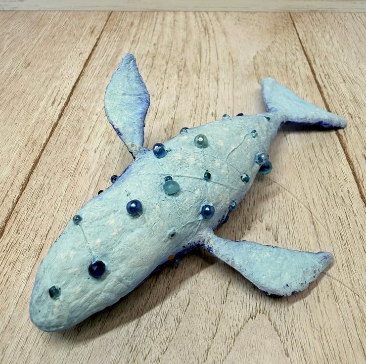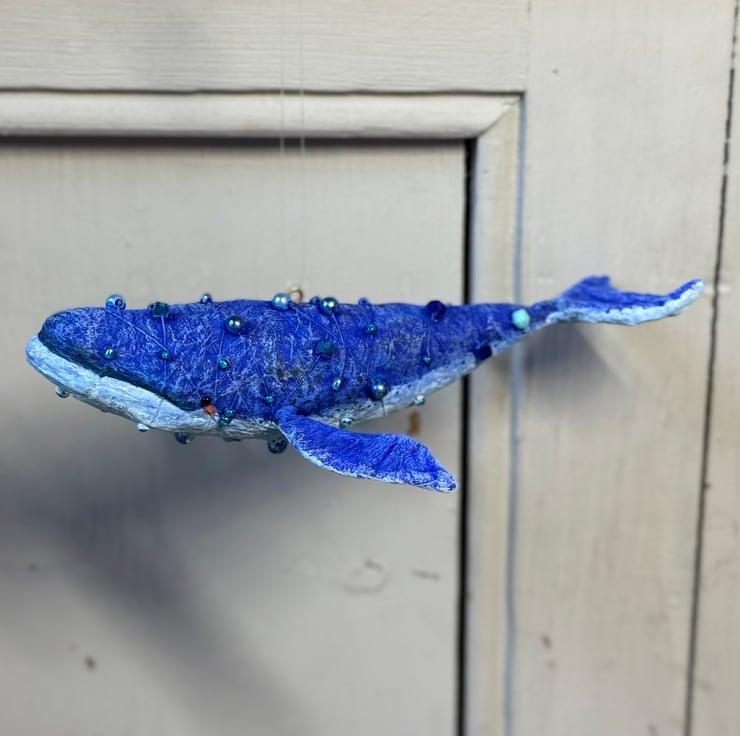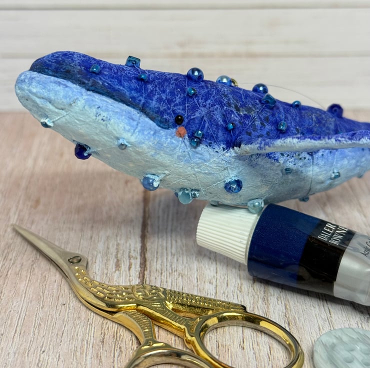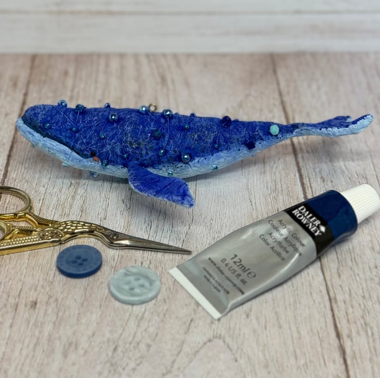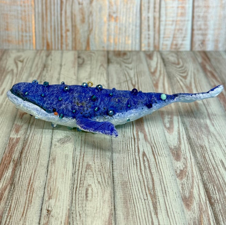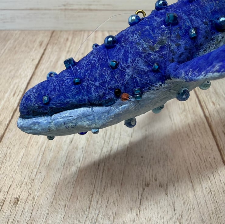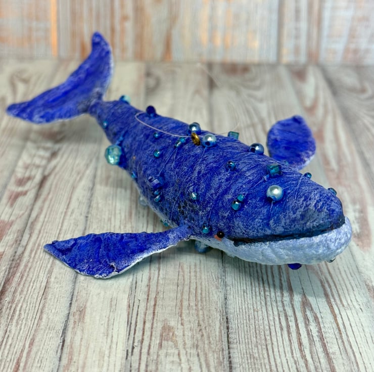 Whimsical spun cotton Art Doll that is entirely hand painted with glass bead eyes. Whale body is decorated with various beads. Doll comes with transparent loop hanger and measures roughly 14.5cm long and 3cm high.