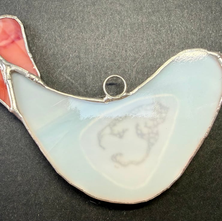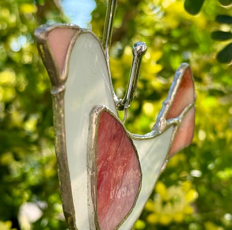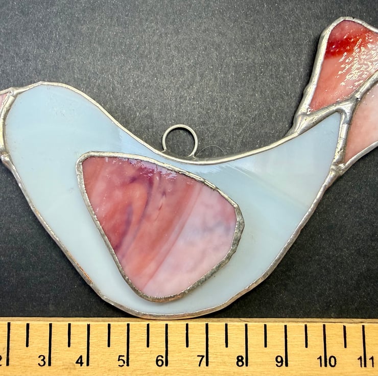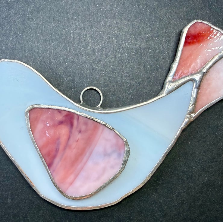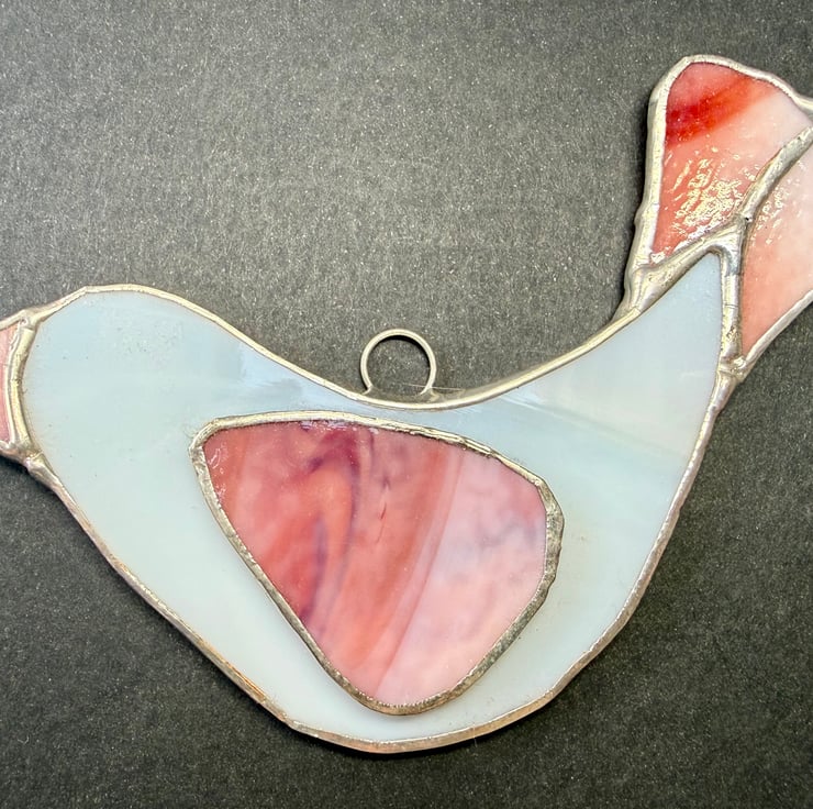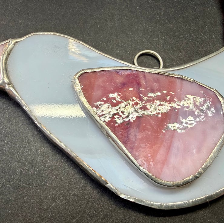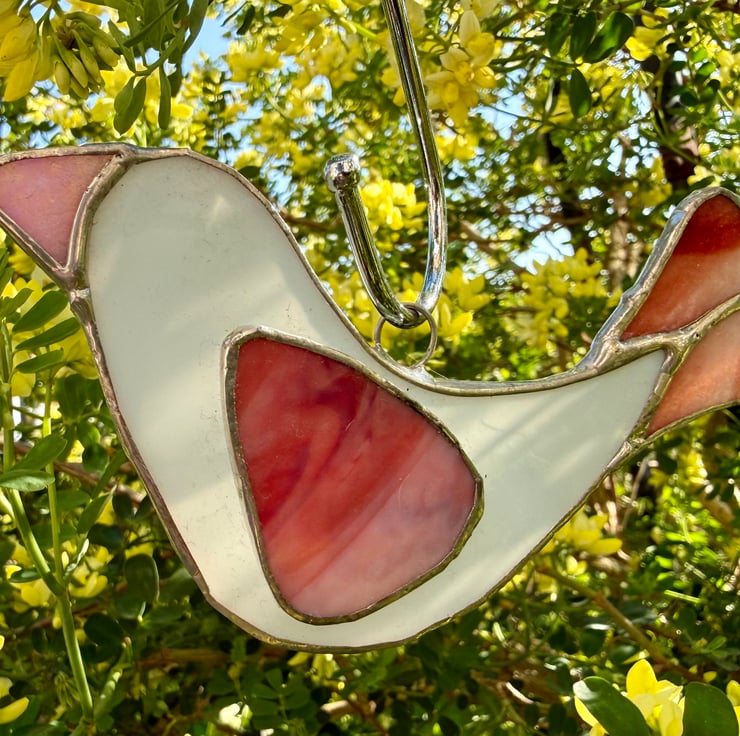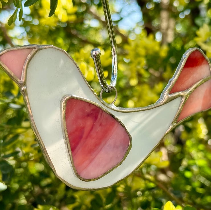 This listing is for one handmade stained glass dove suncatcher, crafted with a softly glowing white glass for the body. The main wing and tail are cut from a rich multicoloured glass that moves through light pink, deep pink, and into warm red, creating a gentle gradient of colour when the light shines through. A soft pink beak completes the design with a sweet, subtle touch.