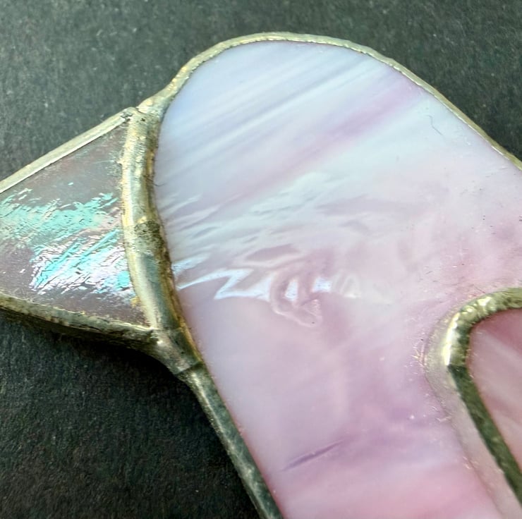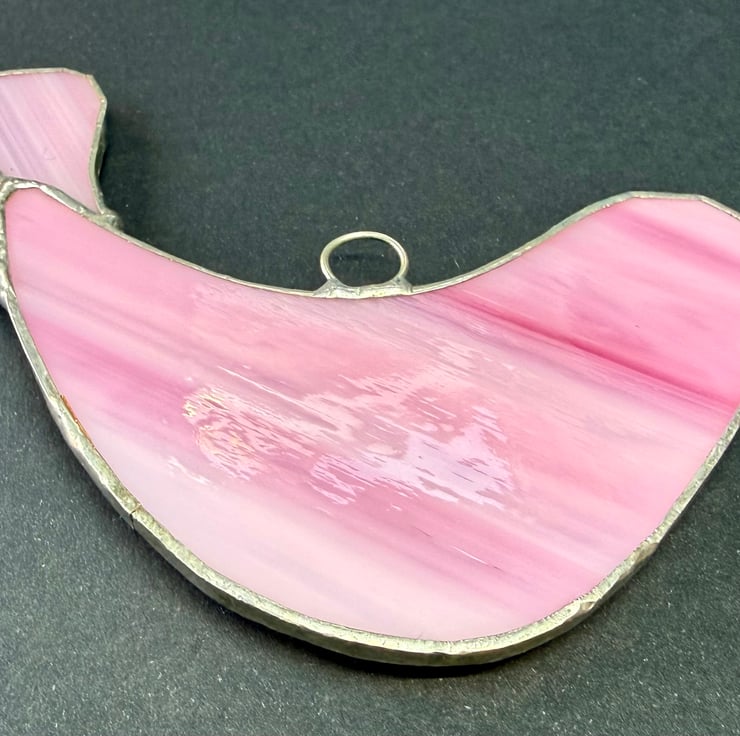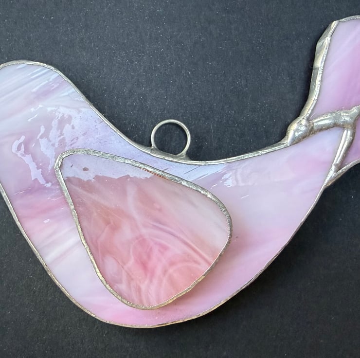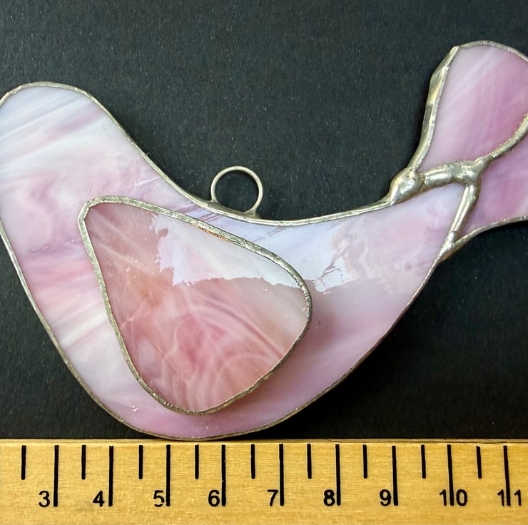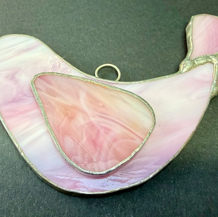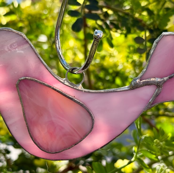 This listing is for one handmade stained glass dove suncatcher, created with a mid pink glass for the body, featuring gentle natural variations that give the piece depth and softness. The wing is cut from a beautifully complementary glass in similar pink tones, touched with a slight yellow glow that adds warmth when the light shines through. The beak is made from an off white glass with a hint of pink, completing the dove with a delicate, harmonious finish