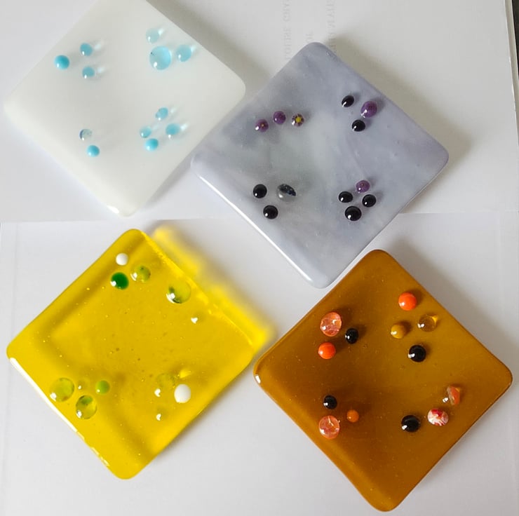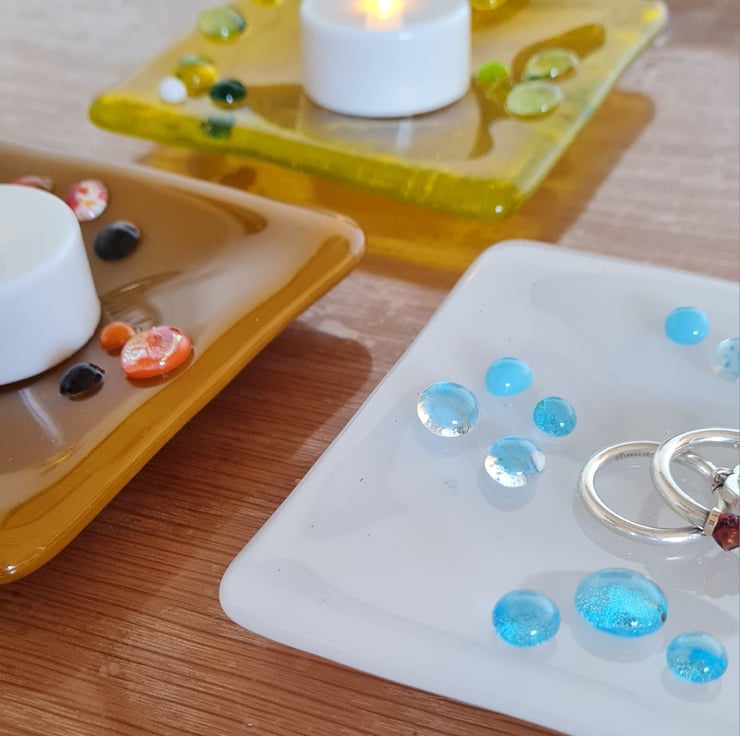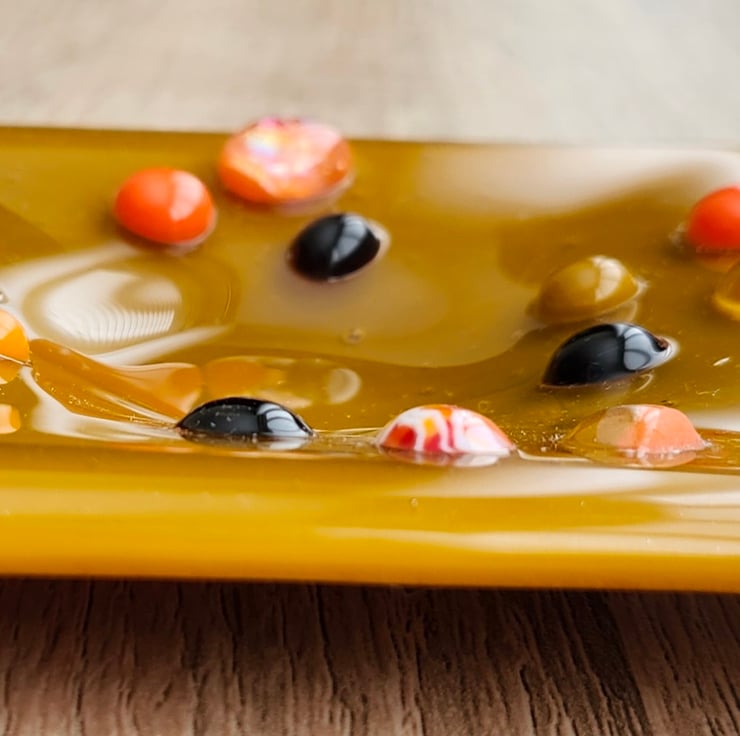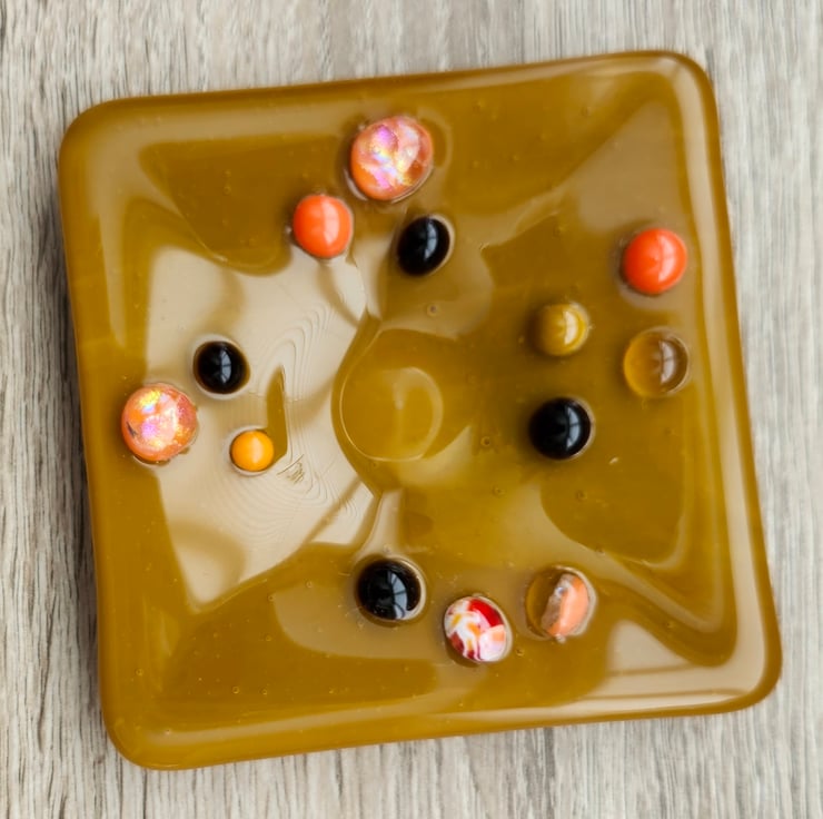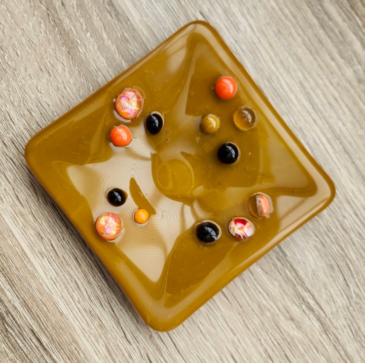 Brown, opaqe, coffee coloured trinket dish, measures 10x10cm is so useful. It can hold your jewellery, keys, lose change and even a small candle of tealight. Small orange and brown dots of glass, give it an extra texture, making it tactile to the touch.