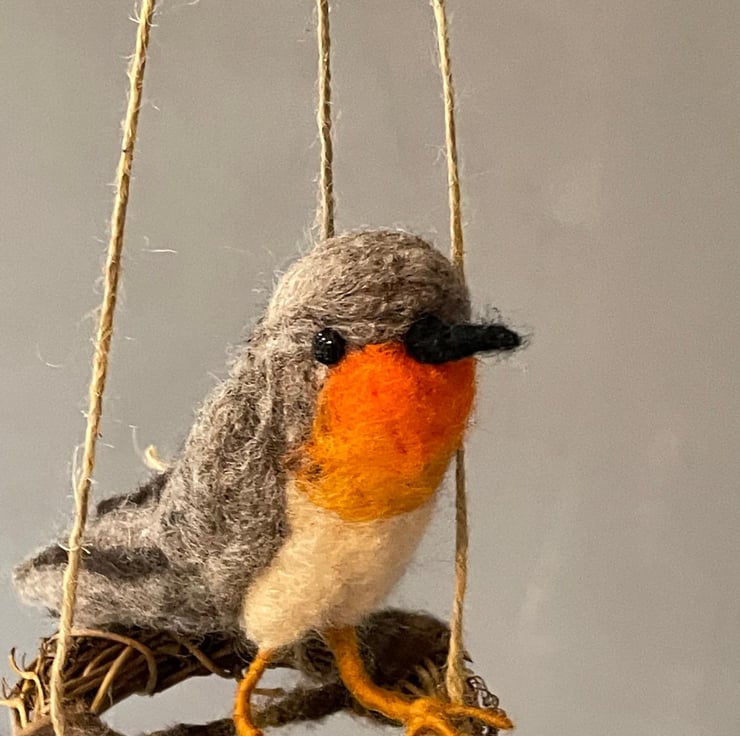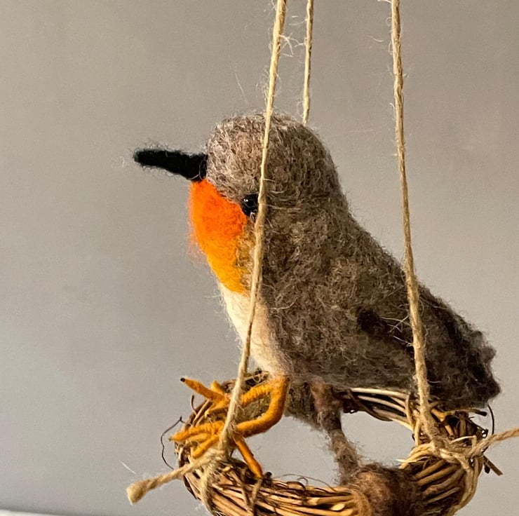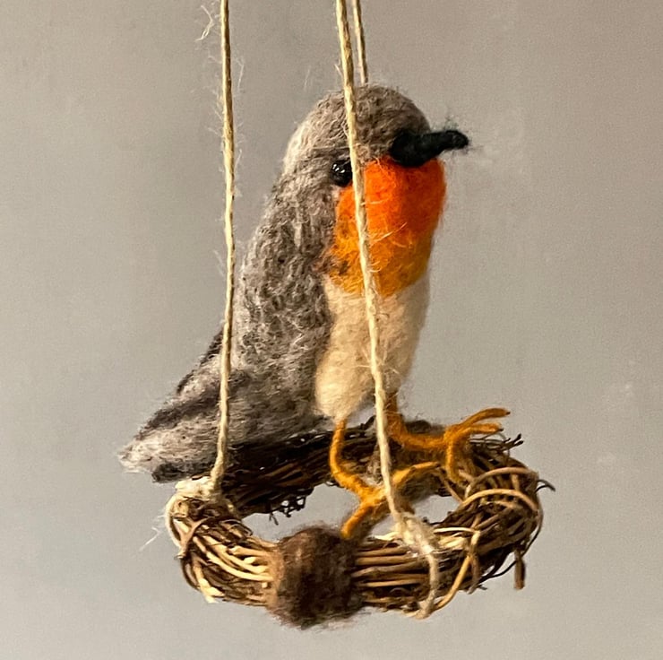 This handmade felted robin sits quietly on its tiny swing, as if pausing mid-song. Inspired by the familiar charm of garden visitors and the comforting presence of robins throughout the seasons, this piece brings a touch of warmth and whimsy to any space.