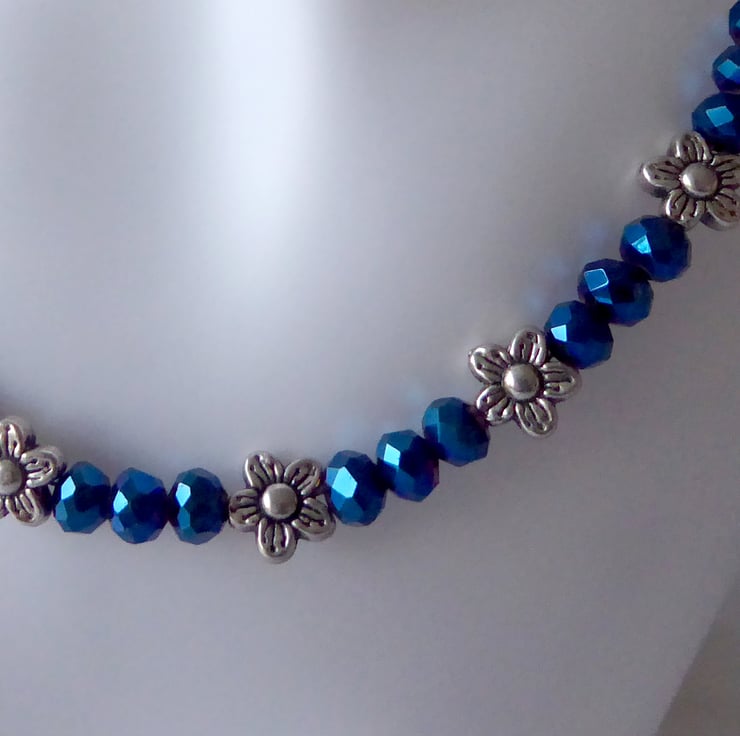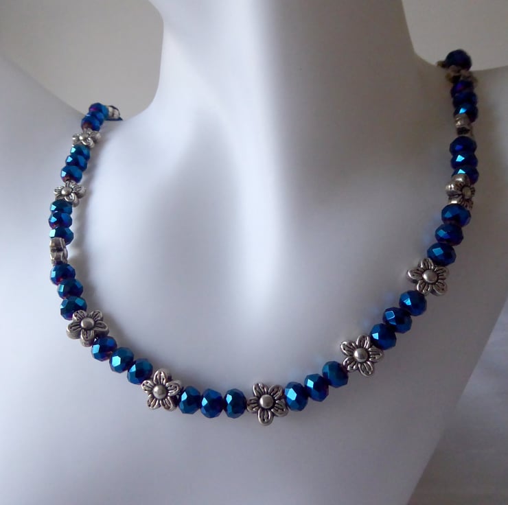 Blue Faceted Bead Necklace with Tibetan Silver flower accents