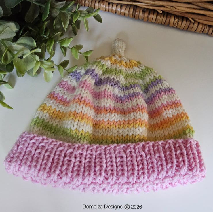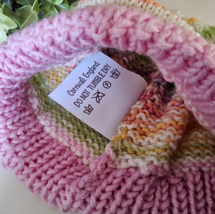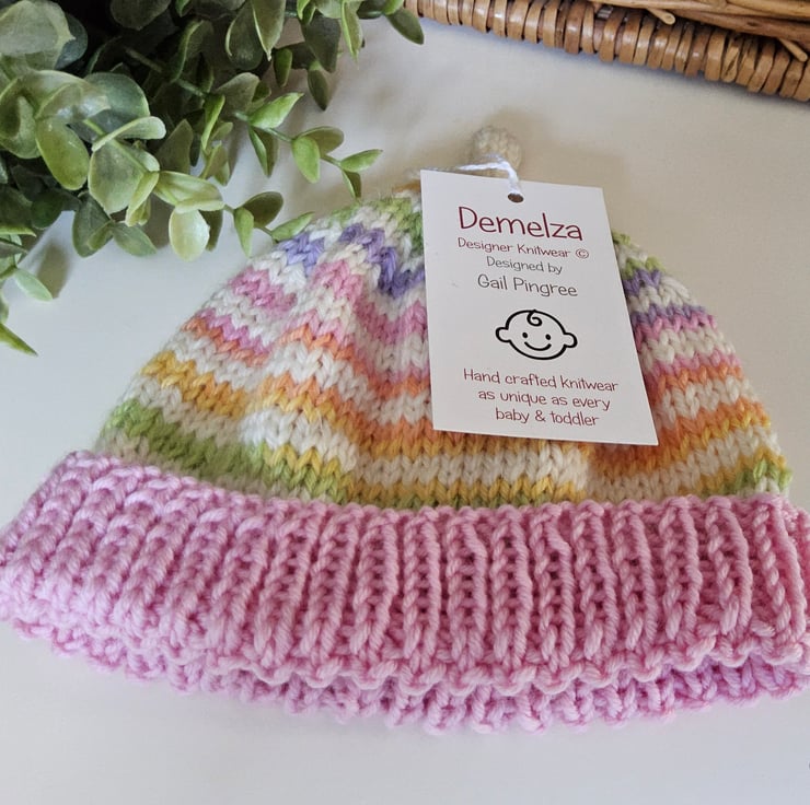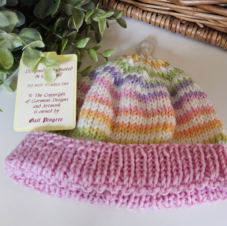 A sweet cosy super soft baby hat guaranteed to keep a babies head and delicate ears protected from the cold and wind. It has been designed and hand crafted in Cornwall using a luxurious cream 'Jeager' and Italian branded pure marino wool complimented with a designer multi coloured 70% marino wool yarn. The yarns are garanteed machine washable by the manufacturers. Please refer to photographs of ball band details.