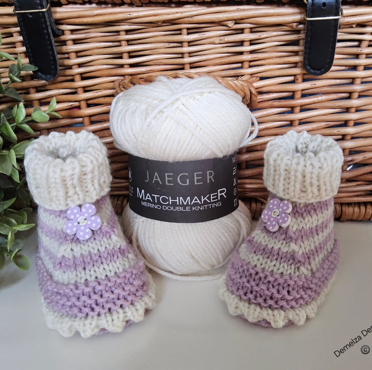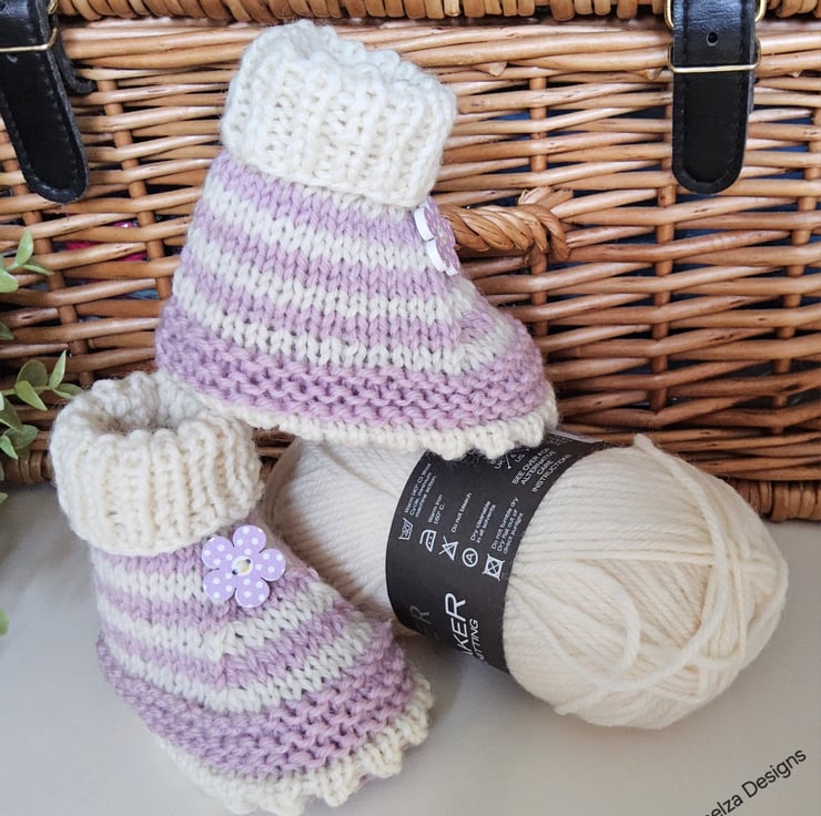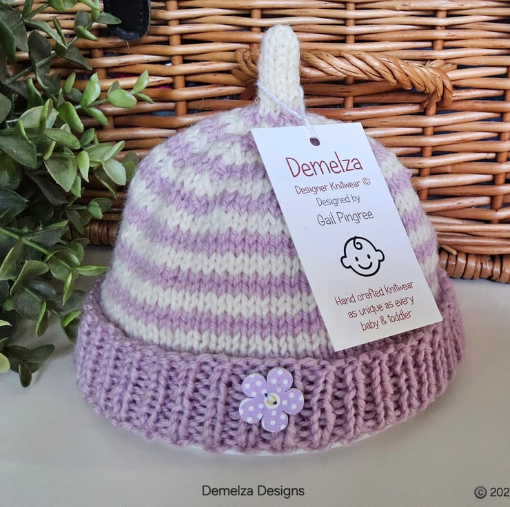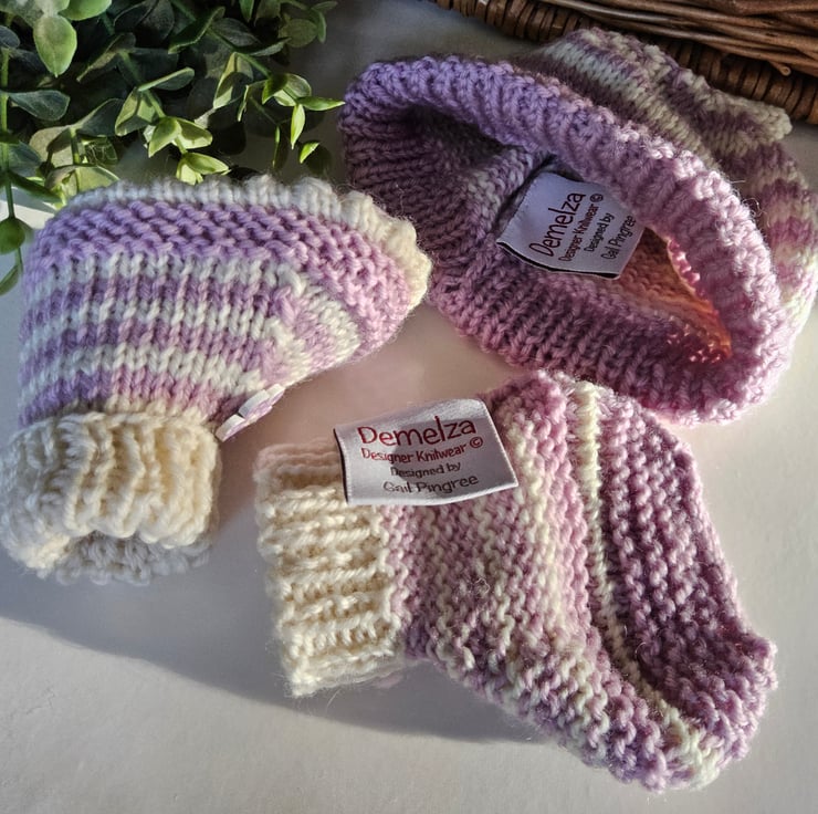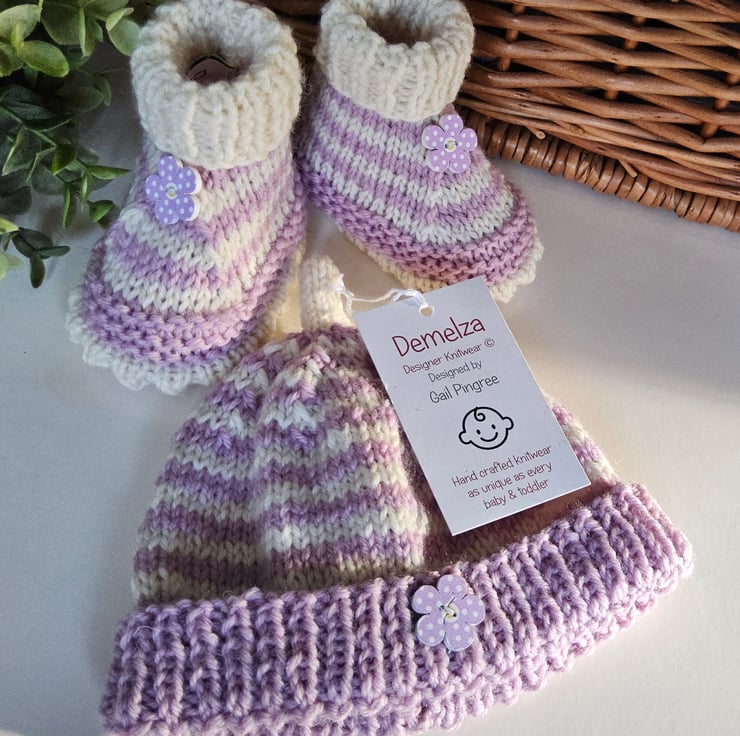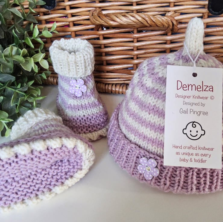 The designer garment swing tags will be attached to the hat and one bootie prior to dispatching. The branded Demelza soft woven damask garment label is attached to the inside back seam of the hat and one bootie with the care instructions woven within it for lasting reference.