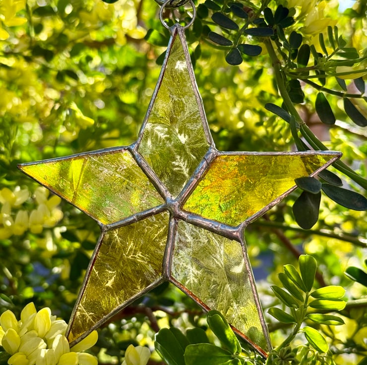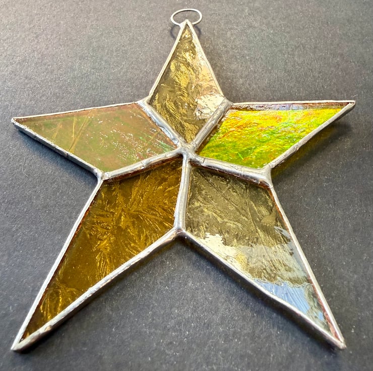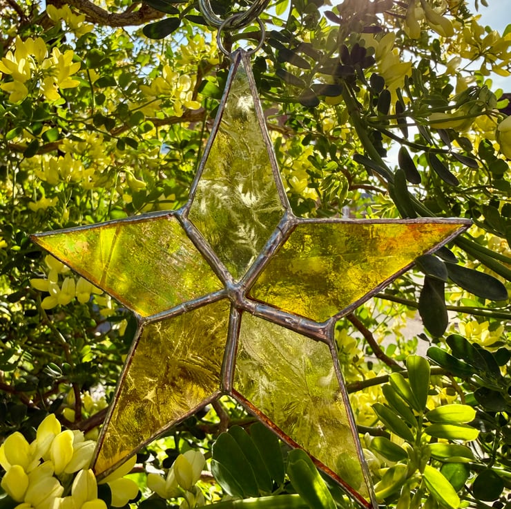 This hand crafted stained glass star is made from five beautiful pieces of golden glass in three complementary styles: