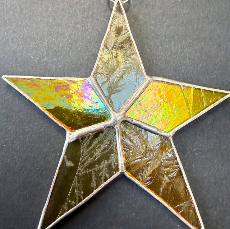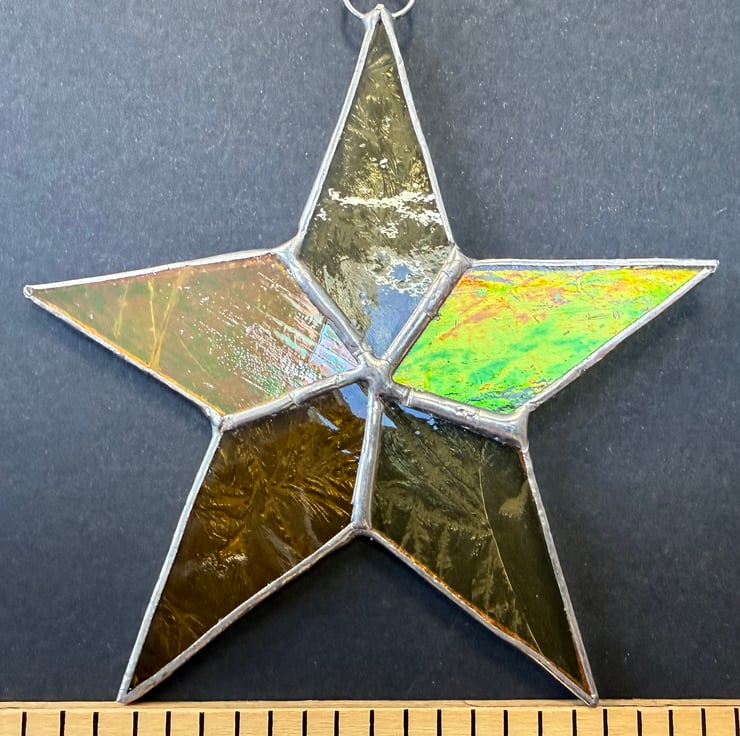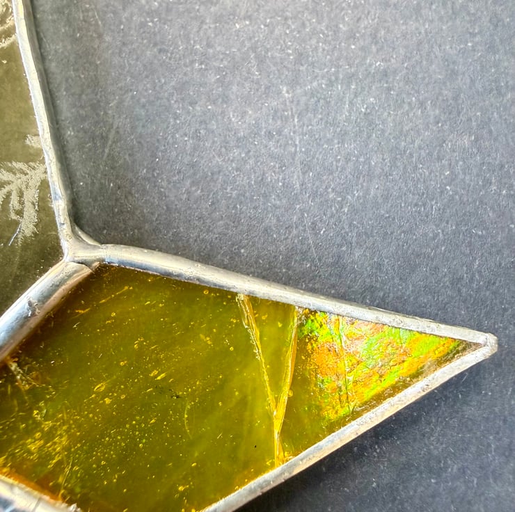 This star was inspired by the layered warmth of golden light — the frosted glow of gluechip glass, the deep honey of amber, and the magical shimmer of iridescence. Together they echo the feeling of candlelight on winter evenings or sunlight filtering through autumn leaves.
